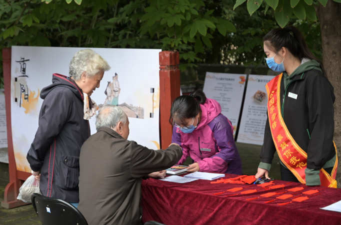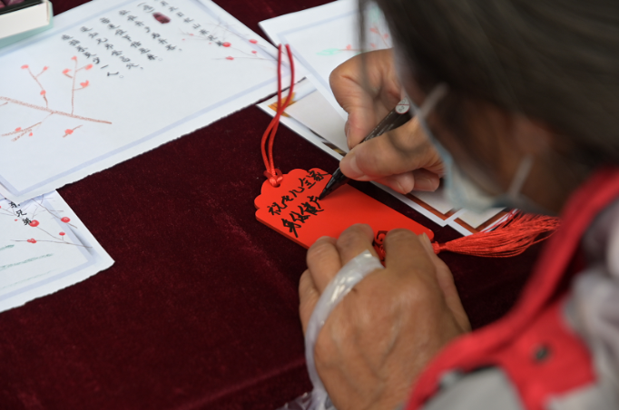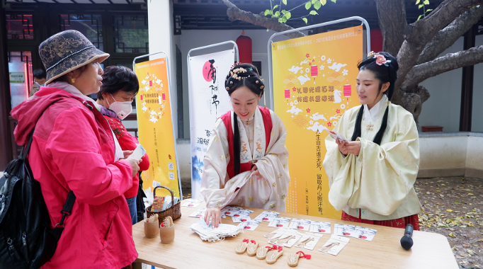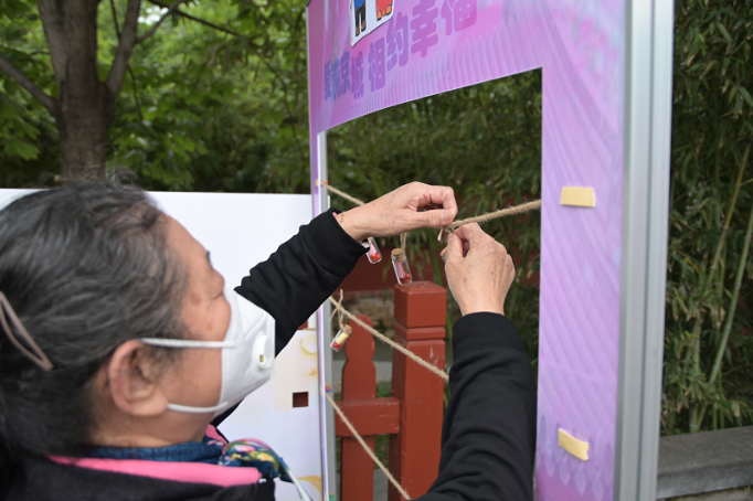 在紫竹院公园福荫紫竹院禅院外,公园为老年人举办了“民俗、祈福、诗词互动”活动。在重阳习俗展示区,老人们饶有兴致地在知识展板上了解重阳民俗,有人还参与制作了许愿瓶、书写了祈福文字,为自己和朋友祈福。