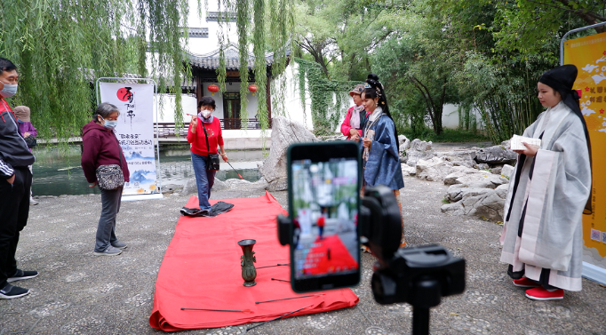 10月14日上午,香山公园致远斋内传出阵阵音乐声,一场融入了红色文化、京味文化、古都文化于一体的精彩文艺演出正在上演。演员们轮番上阵,表演歌舞、昆曲、国乐演奏等节目,虽然今天的天气有些阴沉,但台下的中老年观众看得津津有味,频频叫好。