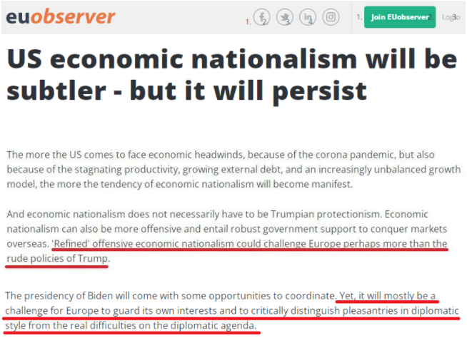 △“欧洲观察家”网站专栏文章《美国的经济民族主义将变得更加狡猾——但会继续存在》截图