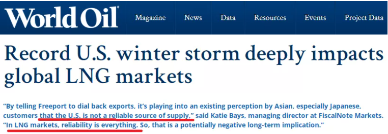 △WorldOil网站文章援引专家观点认为,美国的液化天然气断供已经使一些国家怀疑美国的可靠性。而在液化天然气市场,可靠性就是一切。