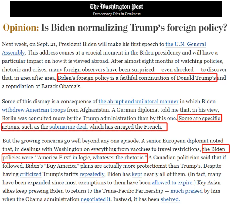 △美国著名记者、时事评论家法里德·扎卡里亚在《华盛顿邮报》发表评论文章指出,美国的盟友经过数月观察后沮丧地发现,拜登的外交政策是“特朗普主义”的忠实延续,无论如何矫饰都还是“美国优先”。