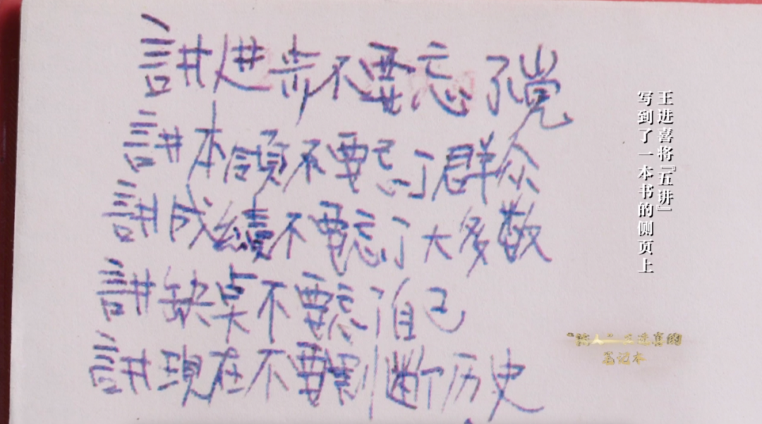 这个笔记本,不仅见证了王进喜参加大庆石油会战的全过程,也写下了“铁人”内涵丰富、充满哲理的“五讲”:“讲进步不要忘了党;讲本领不要忘了群众;讲成绩不要忘了大多数;讲缺点不要忘了自己;讲现在不要割断历史。”它不仅是“铁人”王进喜一生学习实践的思想结晶,也是大庆精神铁人精神的生动写照。