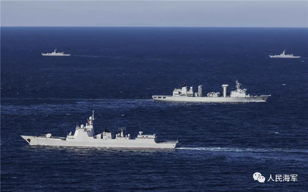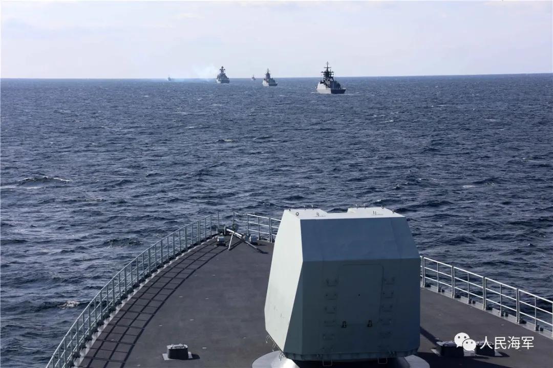 △当地时间10月15日,中俄“海上联合—2021”演习进入实兵演练阶段,这是海军101舰艇编队在联合机动。王游摄