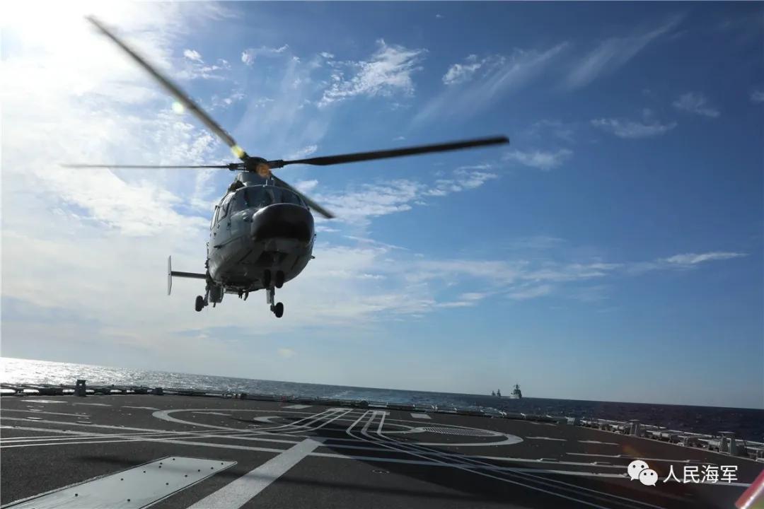 △舰载直升机在南昌舰甲板起飞。马宁摄