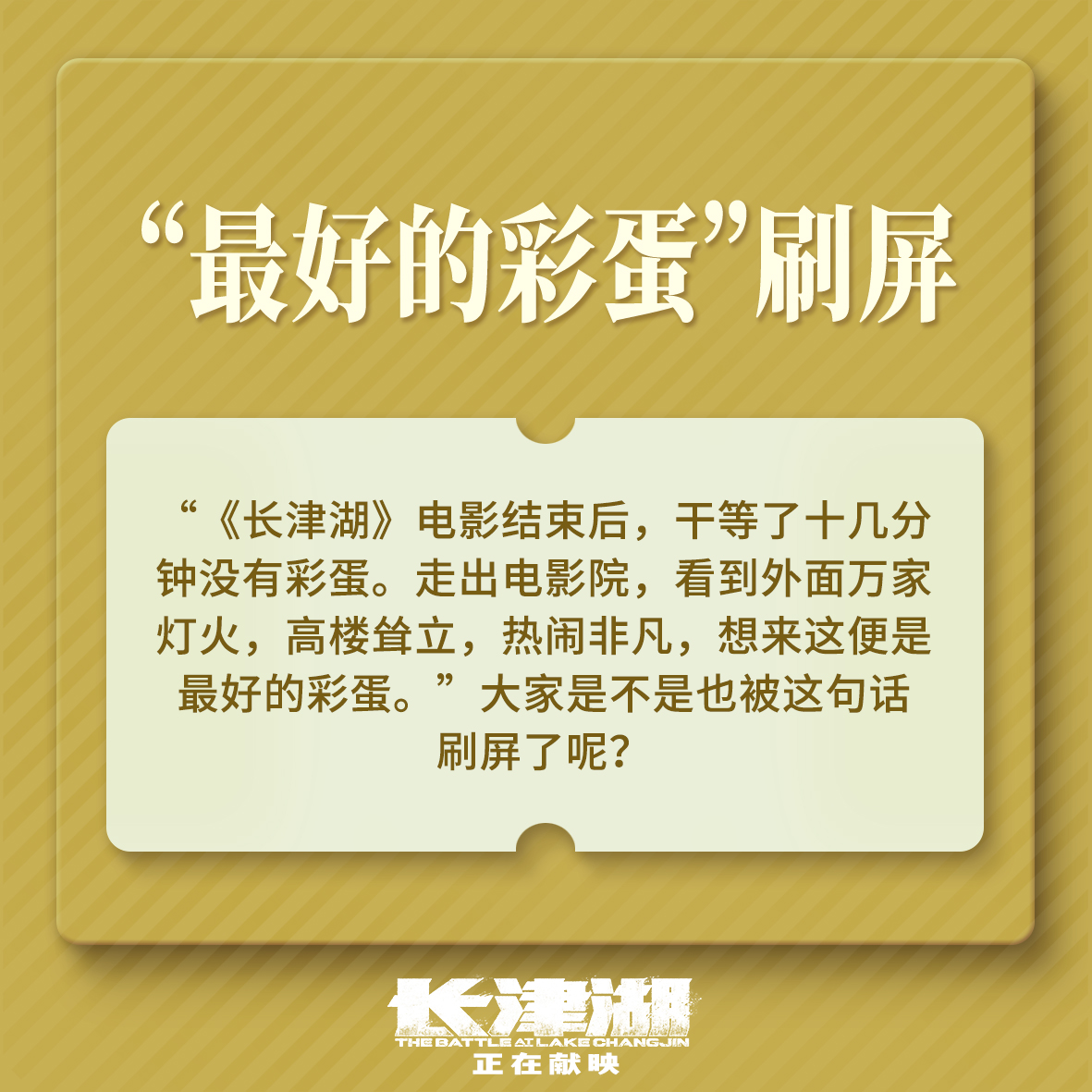 电影《长津湖》真实还原了71年前那场壮烈的战役,生动展现了那段不朽的历史,讴歌了伟大的志愿军战士。宏大的制作,精心的筹备,主旋律的精神内核,让《长津湖》既有主旋律影片的严肃基调,也通过共情的艺术还原点燃观众的爱国情怀。很多观众二刷三刷《长津湖》,跟随电影追寻英雄足迹,走进当年那场硝烟弥漫的壮烈战场中,感受志愿军战士们在战场上奋勇杀敌,为国而战的热血豪情。当观众们走出电影院,看到灯火绚烂、高楼林立,生出“何其有幸生于华夏”的自豪之情,这便是《长津湖》最后的也是最好的“彩蛋”。