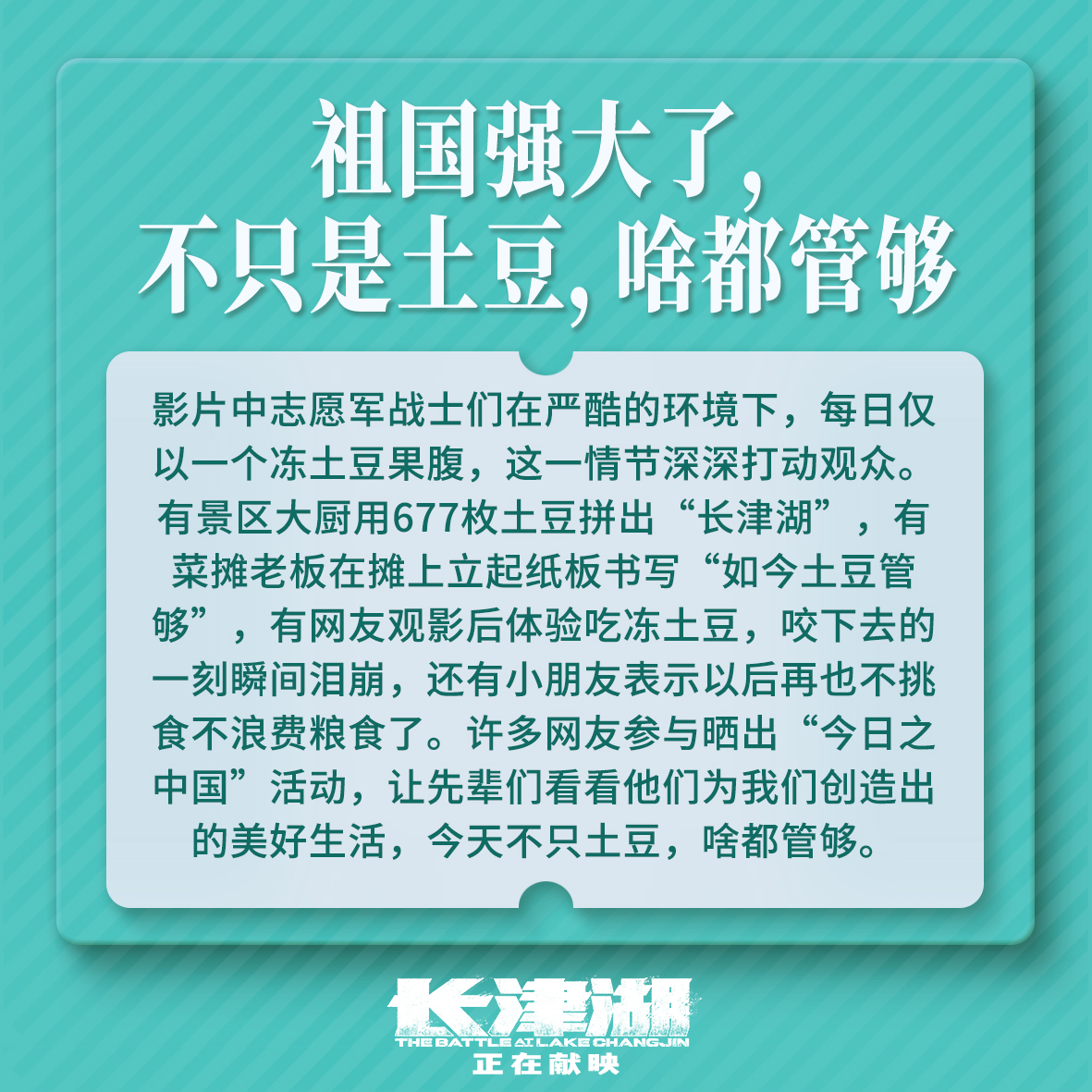《长津湖》传递的家国情怀也感染无数观众,片中不少细节令人潸然泪下。电影中,志愿军战士们在严酷的环境下,每日仅以一颗冻土豆果腹,这一情节深深打动观众。有景区大厨用677枚土豆拼出“长津湖”;有菜摊老板在摊上立起纸板书写“如今土豆管够”;更有网友观影后回家效仿啃冻土豆,发现根本无法咬动,难以下咽。这位网友表示,吃了第一口就觉得很心酸,并想到今天的美好生活都是英雄们抛头颅洒热血换来的,更应该倍加珍惜。