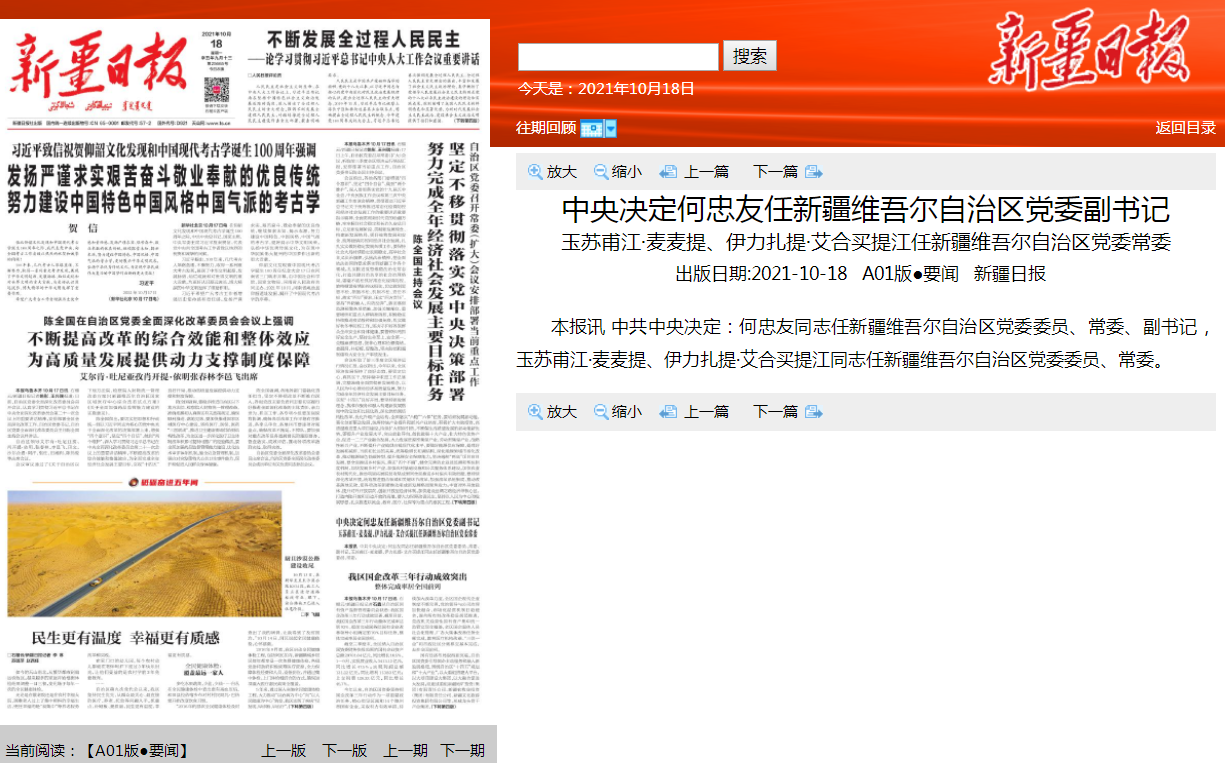 据新疆日报10月18日消息,中共中央决定:何忠友同志任新疆维吾尔自治区党委委员、常委、副书记,玉苏甫江·麦麦提、伊力扎提·艾合买提江同志任新疆维吾尔自治区党委委员、常委。