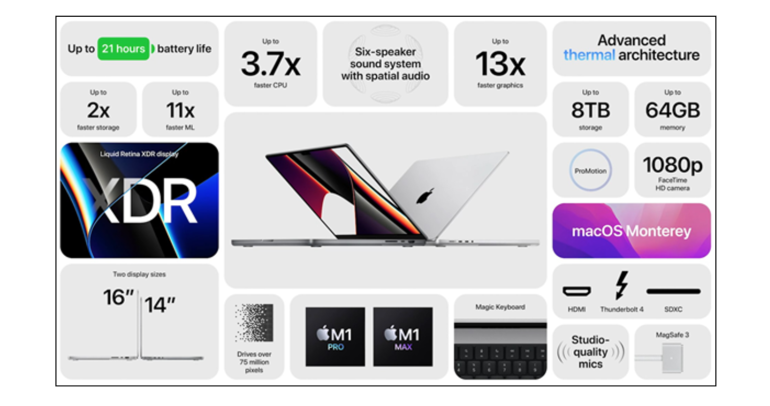 两款MacBook Pro也采用了全新的外观设计,以及更为强大的M1系列芯片。据苹果方面介绍,与M1相比,M1 Max的图形处理速度要提高4倍,晶体管比M1 多达3.5倍。