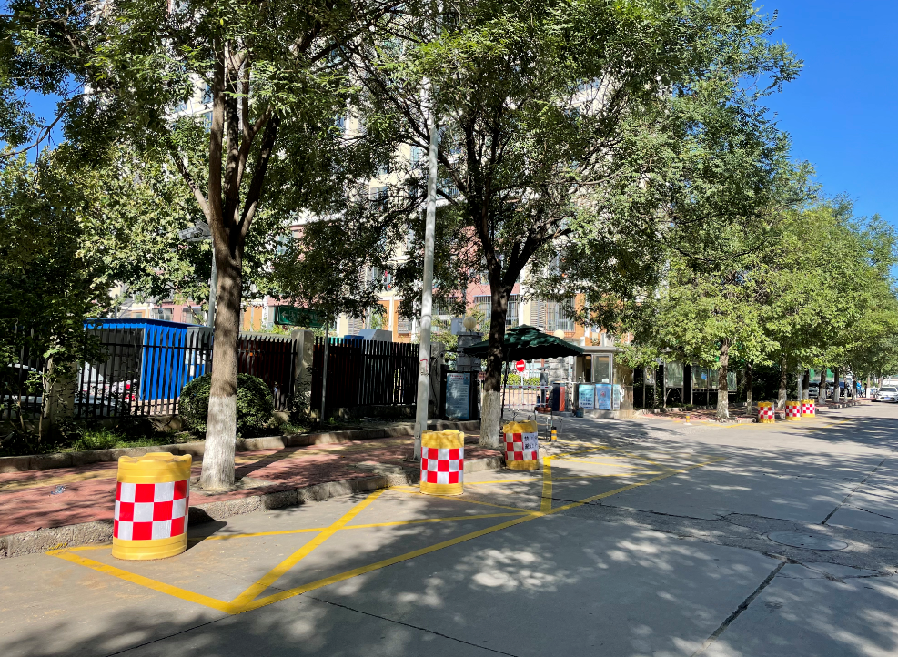 第四种方案则是在小区东门外增设隔离墩,划出一片禁停缓冲区,这样就能清晰地看到过往车辆,保障视线不再受阻。这种隔离墩是塑料材质的,用沙子注水制作而成,还可以移动,并且材质较软,比较安全。除此之外,隔离墩表面涂有不同颜色,夜间可以反光。经过讨论,居民一致同意安装隔离墩。