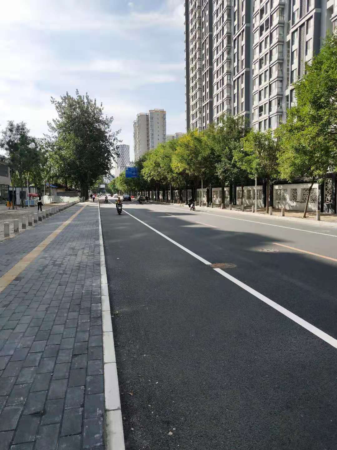 经过前期大量踏勘、研究等准备工作,朝阳区交通委本着“慢行优先、绿色优先”的交通发展理念,在多次实地调研的基础上,通过科学优化及规划,同时努力与周边产权单位及商户协商沟通,最终打通区域壁垒,在路段南侧增设了人行步道,并于道路两侧增设非机动车道,原道路从8米拓宽至12米。工程于8月23日正式开工,针对沥青路面龟裂、破损,人行道破损,老化等病害一并进行养护维修,此路段的养护改造不仅提升了道路通行环境及通行能力,更充分解决了人、机、非混行的问题。