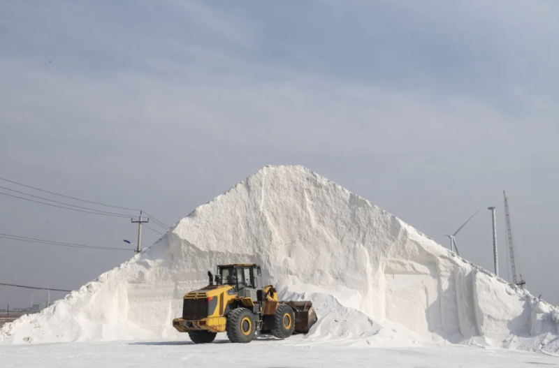 在大片的盐田现场可以看到,洁净的原盐采扒上车后,被送入机泵,喷淋、洗涤后,经过传送带上滩成坨,一座座盐坨渐渐成形,一幅盐业丰收的景象展现在眼前。