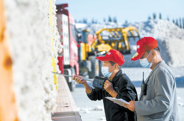 工作人员在新疆维吾尔自治区尉犁县众望纺织有限公司检测新棉质量。 新华社记者 赵戈 摄