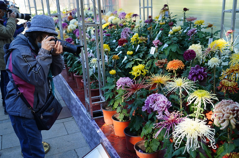 “本届展览的一大亮点就是万佛楼景区展示的来自北京菊花协会20余家会员单位的300多个品种标本菊。我们还设立了单独展台,展示栽培历史在百年以上的菊花,比如玉蝶,花瓣像羽毛一样,颜色多变,可由浅鹅黄色变化至白色。”北海公园副园长胡峂介绍。