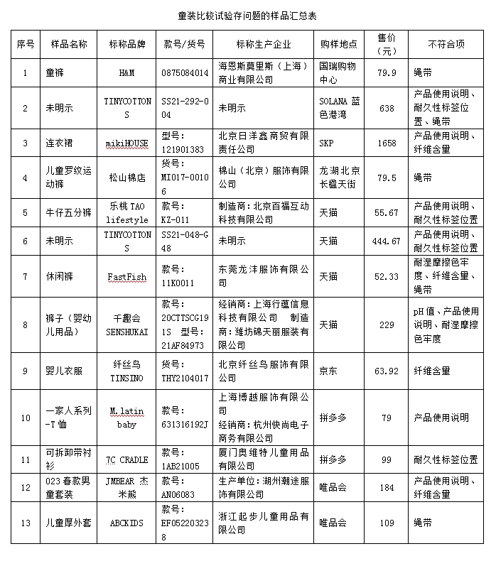 其中,H&M一款售价79.9元的童裤和松山棉店一款售价79.5元的儿童罗纹运动裤,均测试发现“绳带”不符合要求。