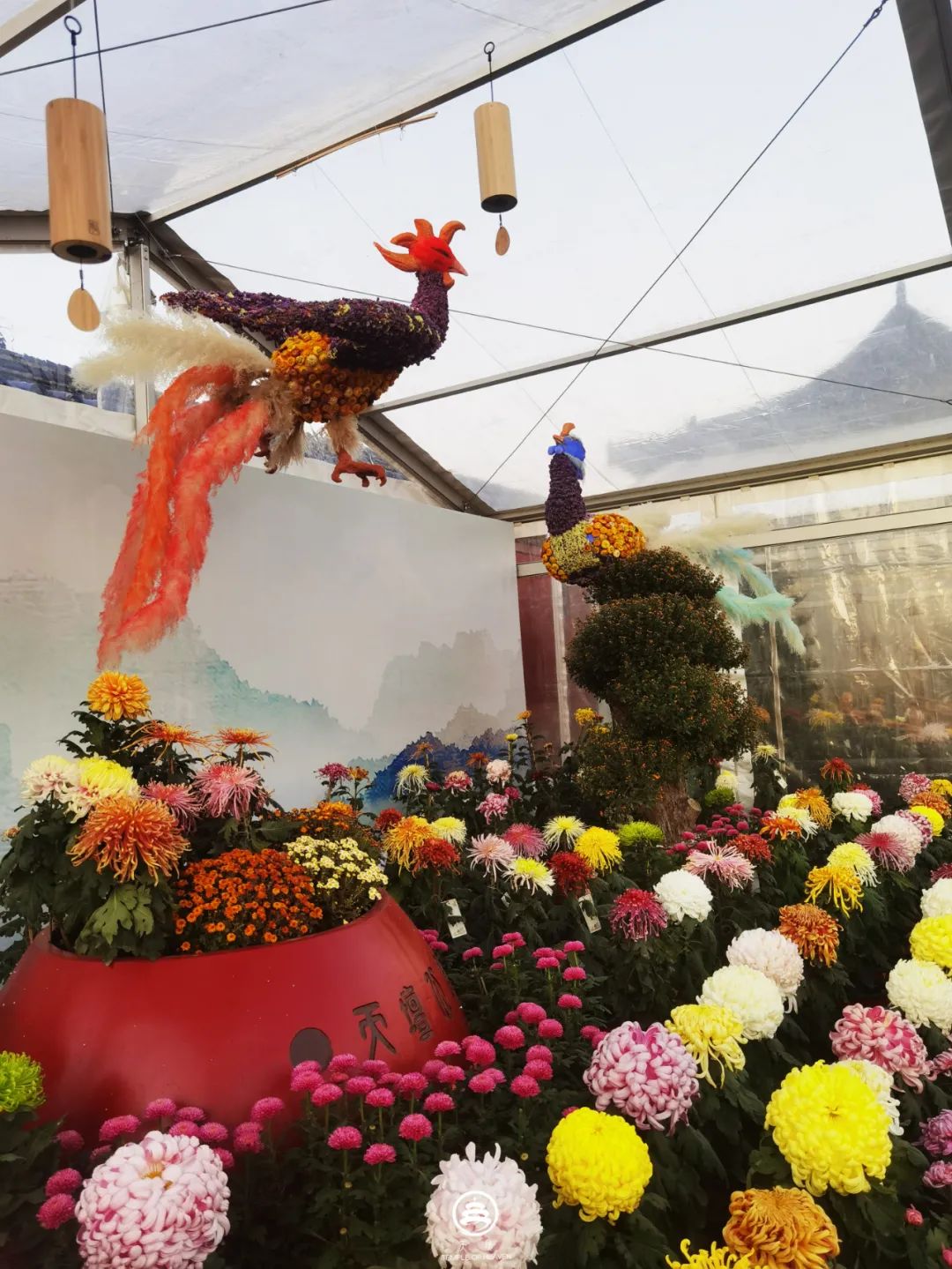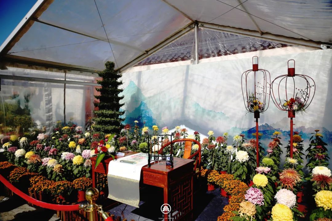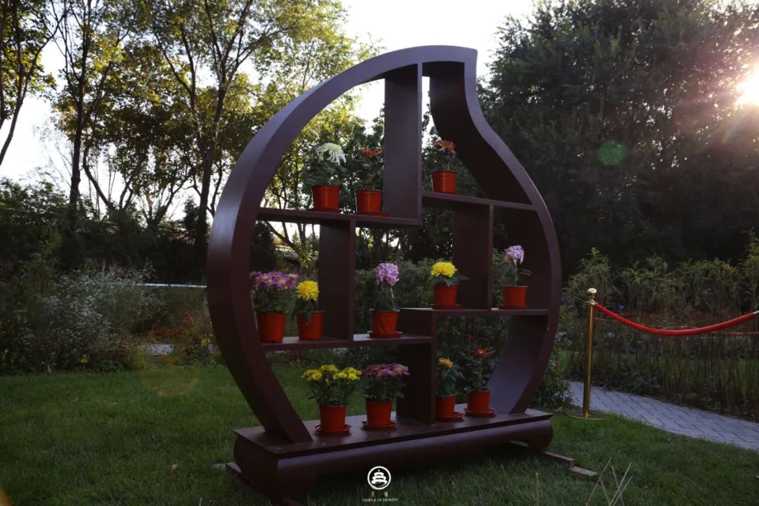 品种菊、盆景菊、小菊……团团簇拥的花中,是“埙”象征的中和韶乐、枝头的鸾凤和鸣,搭配上琅琅风铃