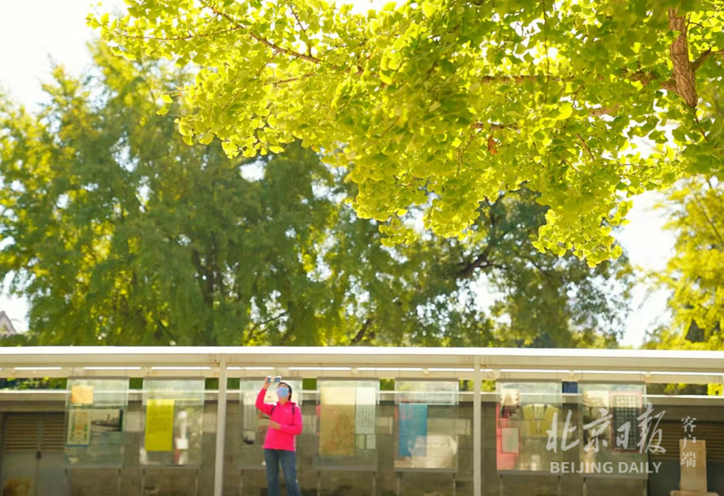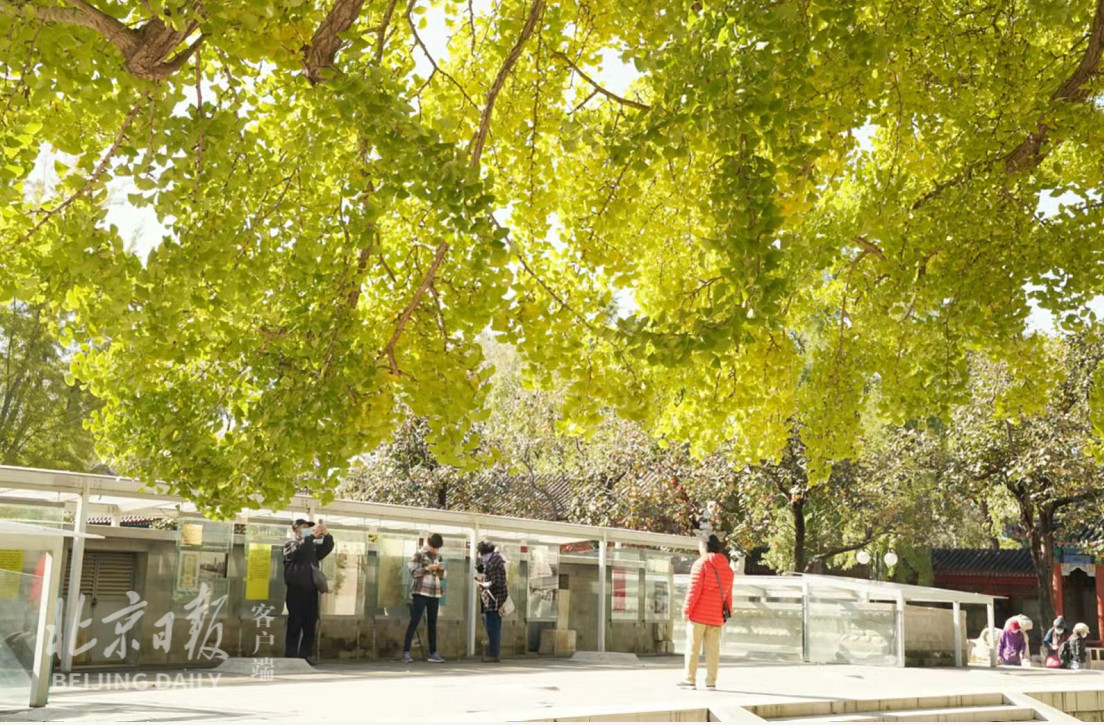 五塔寺内金刚宝座塔前的两株古银杏树,距今已有600多年的历史,金黄色的银杏叶展开“树树皆秋色”的画卷,营造出古韵秋景。