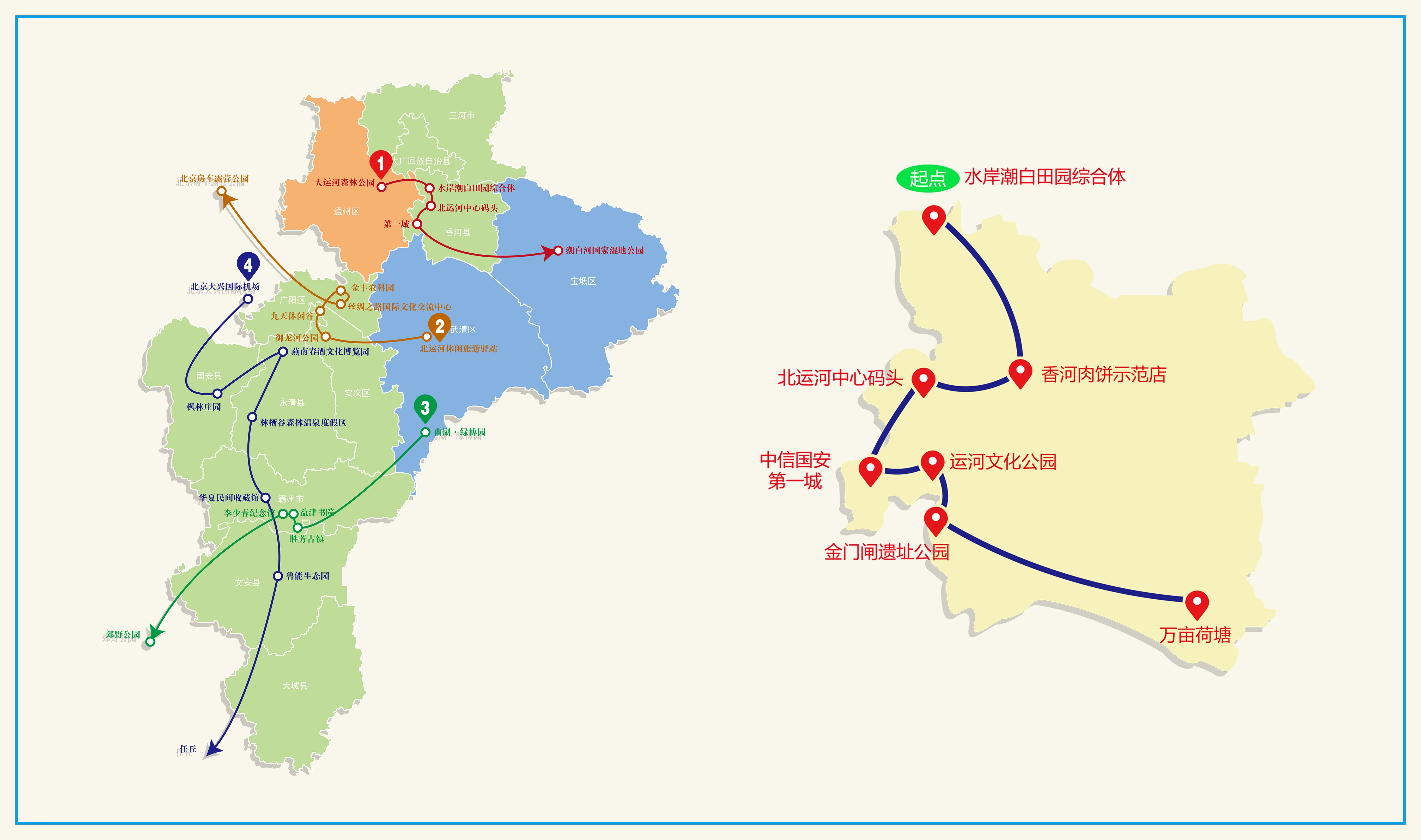 “京津廊运河体验游”“京德高速休闲体验游”“京雄高速洼淀文化游”“京津廊新业态体验游”4条京津冀精品自驾线路,以通州大运河森林公园、大兴国际机场、潮白河国家湿地公园、九天休闲谷等京津冀三地自驾游交通干线或新业态为纽带,串联整合沿线吃住行游购娱等旅游要素,不仅为游客提供了便捷、全面的出行参考,也为京津冀深度整合文旅资源、加强文旅合作提供了重要的产品支撑。