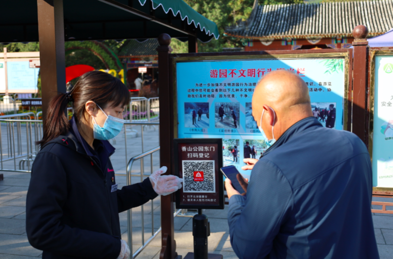虽然看上去需要“闯”好几道关,但记者体验了一下,从进入东门小广场扫码登记、配合安检、进入散客通道、刷身份证入园,只需要两三分钟即可完成。截至今天上午9时许,香山公园东门的游客量并不算多,整体情况平稳有序。
