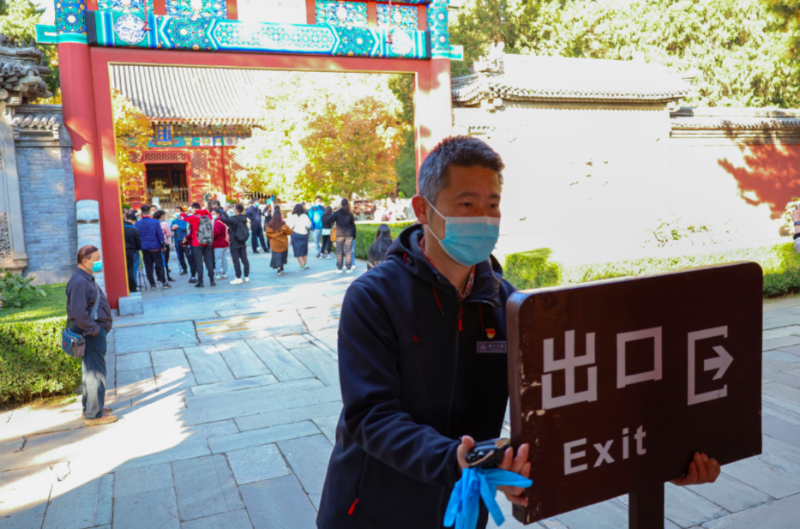 防疫有保障,游园安全也要有保障。宋国刚又把记者带到下一个进园环节,这里专设了几名保安,手持安检机,提示吸烟的游客主动交出打火机,并且逢包必检,为的是保障园区的防火安全。“公园里树木多,秋季天气干燥,容易引发火灾,我们这儿‘卡死了’,也是保障了整个公园的安全。”