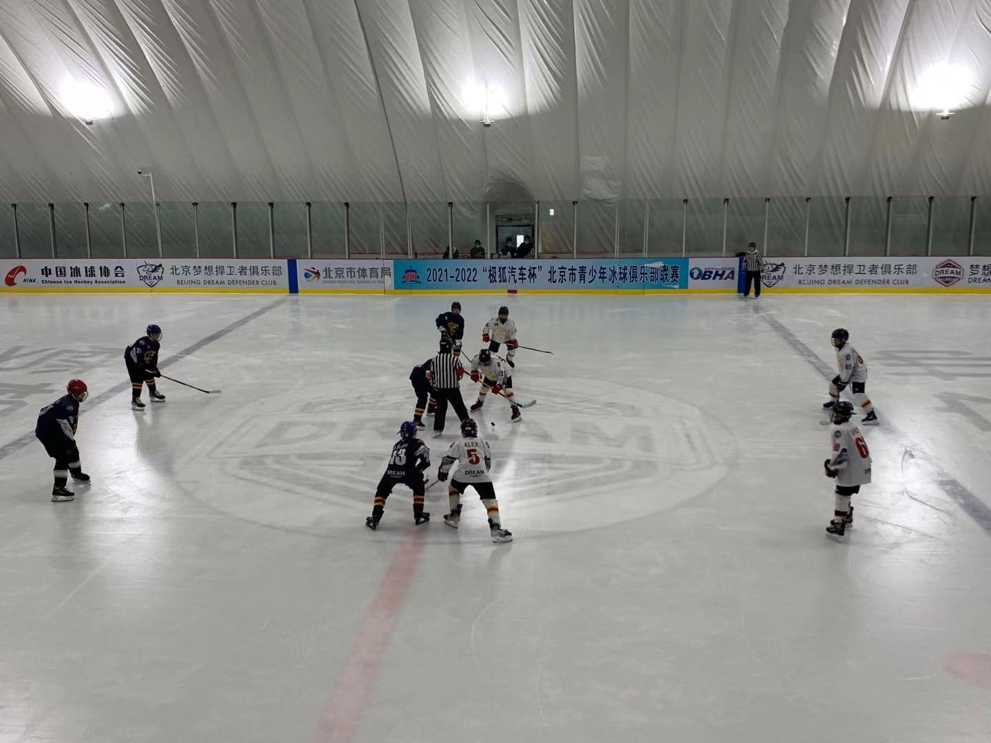 这是周六(10月23日)中午进行的一场2021至2022“极狐汽车杯”北京市青少年冰球俱乐部联赛中的场景。首节比赛经过6分53秒的激烈争夺和对抗后,身穿白色球服的梦想ACE队率先打破僵局。“今天我们这儿要打六场比赛呢!这只是其中的第一场。明天还有六场。”“梦想之地”的工作人员介绍说,“这是北京市冰球运动协会举办的比赛,从10月初开始,一直要打到明年。现在是第一阶段,后面还有季后赛。”