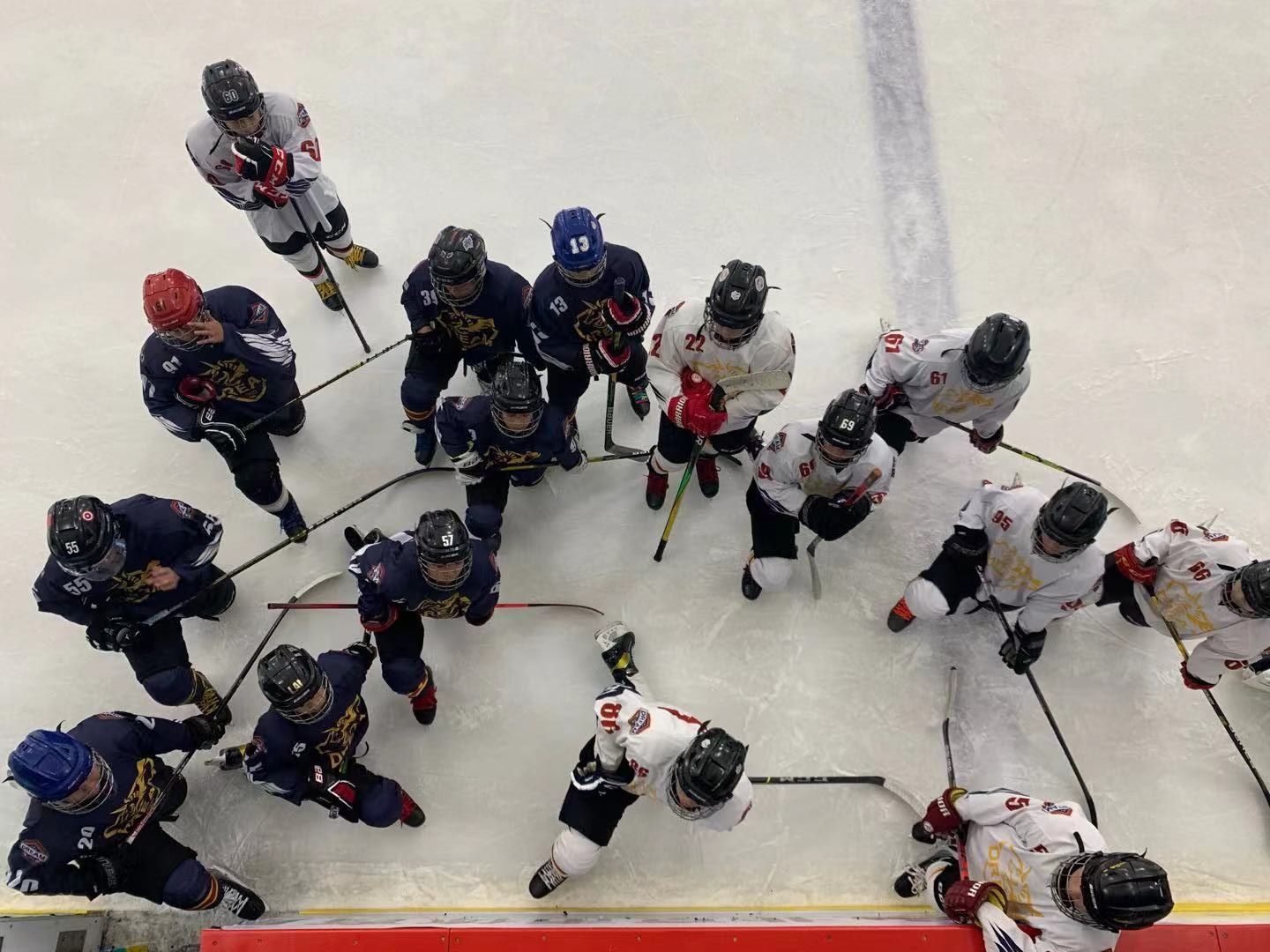 “喔!”一声呐喊从洁白的冰面上瞬间爆发出来。面罩后面,那些稚气未脱、挂满汗水的脸庞上,刚刚还蹙成一团的眉眼顿时舒展开来。完成破门得分后,滑倒在冰面上、身体撞到护墙的95号,握着拳站起身,成为了全队的英雄。他的队友们用球杆在冰面上敲击着,庆祝着,而发出更大声响的,是那些用球杆撞击护墙的孩子们。
