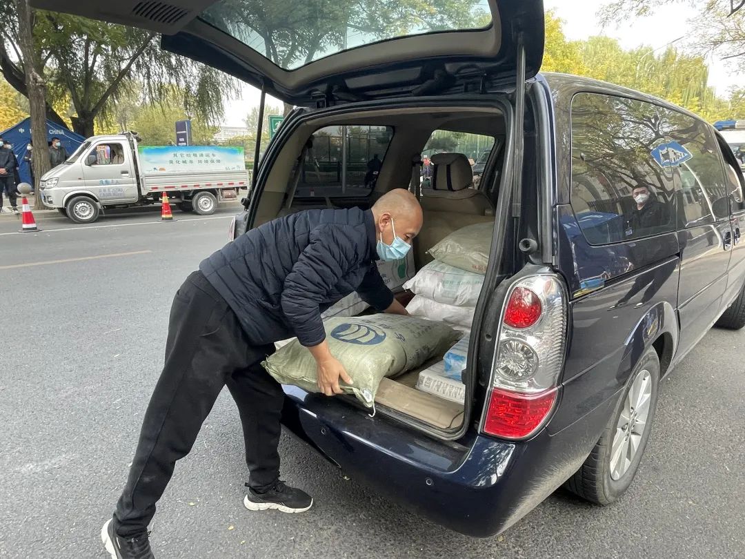 中午时分,一辆蓝色的别克公务车停在芙蓉里社区(西区)北门。王师傅下车打开后备箱,开始把一箱箱的米面粮等物资卸下车。