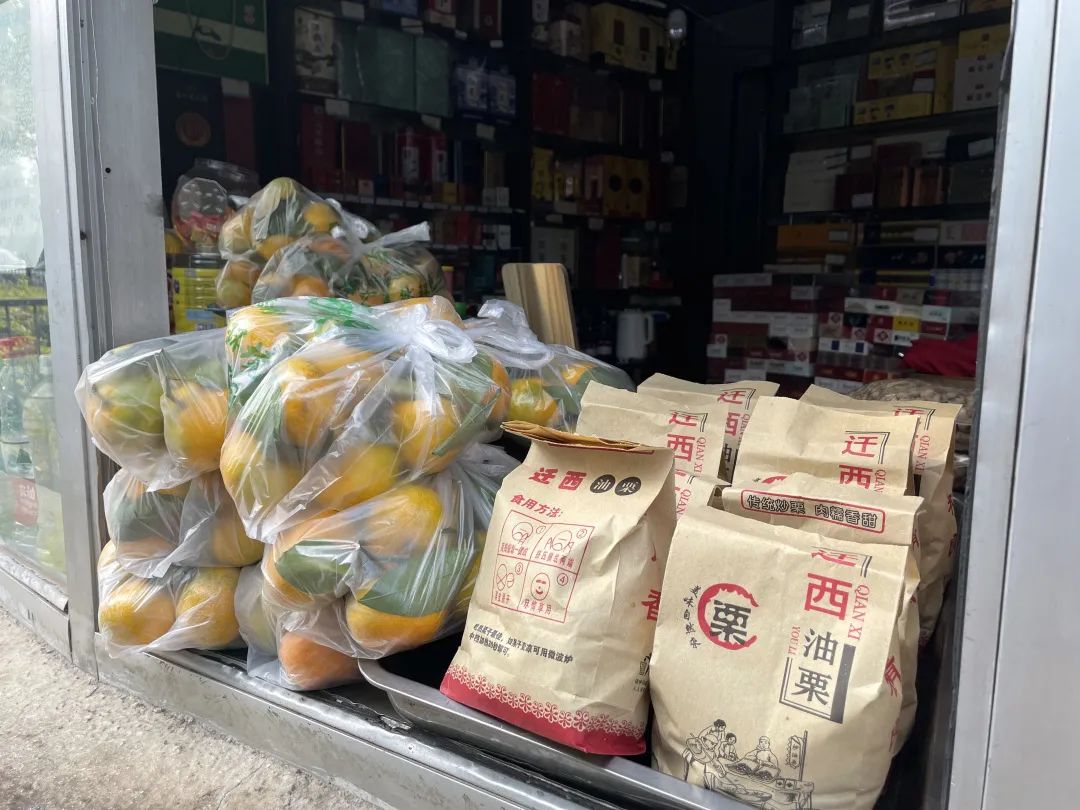 小区北门对面、畅春园体育休闲广场旁边,有一家卖饮料零食的小店。窗外挂着通信大数据行程卡的扫码、微信支付二维码;窗口摆着一排饮料、堆着纸袋子装的油栗。