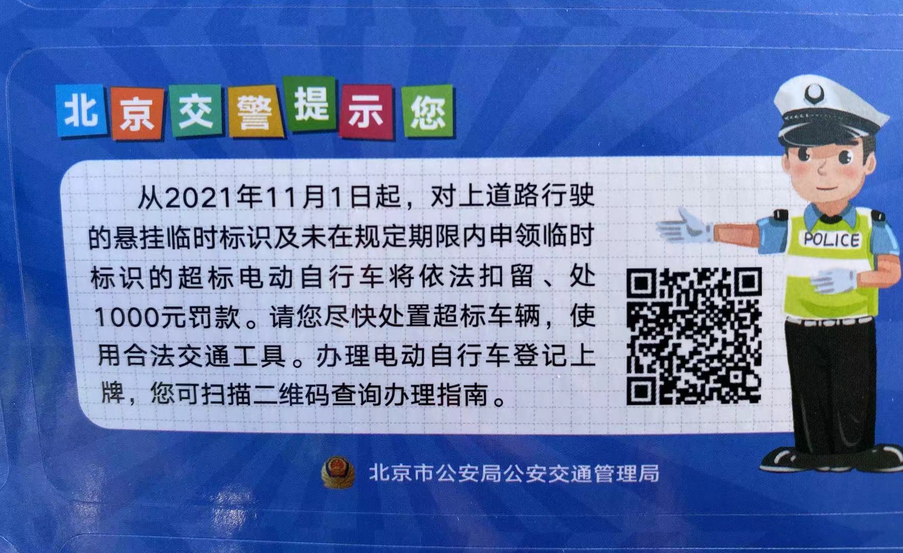 据了解,2018年11月1日开始施行的《北京市非机动车管理条例》规范了本市电动自行车生产、销售、登记、通行、租赁经营、停放及相关管理。其中规定:本市生产、销售的电动自行车应当符合国家标准,对符合规定的发放行驶证、白色号牌,对不符合规定的超标车辆发放临时标识,也就是橙色号牌。对发放临时标识的电动自行车设置3年过渡期,过渡期满后,不得上路行驶。