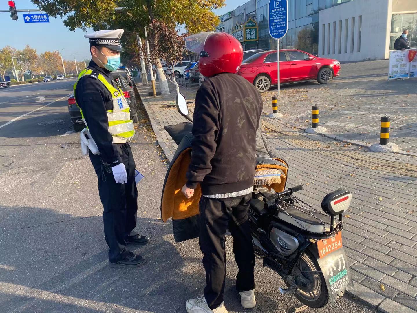 万盛南街与九棵树中路交叉口,是通州区文明交通示范路口,往北通达通州新城,往南连接环球度假区,交通流量大。10月26日早晨7点半,通州交通支队长陵营大队警长崔举梓和同事们来到这里,向骑行超标电动车的市民进行政策宣传引导。“您好,请您稍等。” 崔举梓拦下一位骑行超标电动车的市民,“您这车是超标车,挂的临时牌照,11月1日就停止使用了,到时候再上路可就要面临扣车罚款啦!请您尽快去置换合规车辆。”骑车的市民表示,已经注意到了过渡期即将结束的消息,本周就会到销售网点进行置换。崔举梓还送给了车主一张卡片,扫上面的二维码,就能查询到全市539家在电动自行车销售门店设置的便民上牌服务点,其中在通州区的有45家,几乎每个街道乡镇都有涉及。