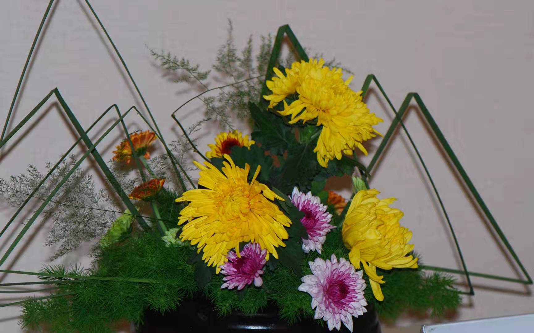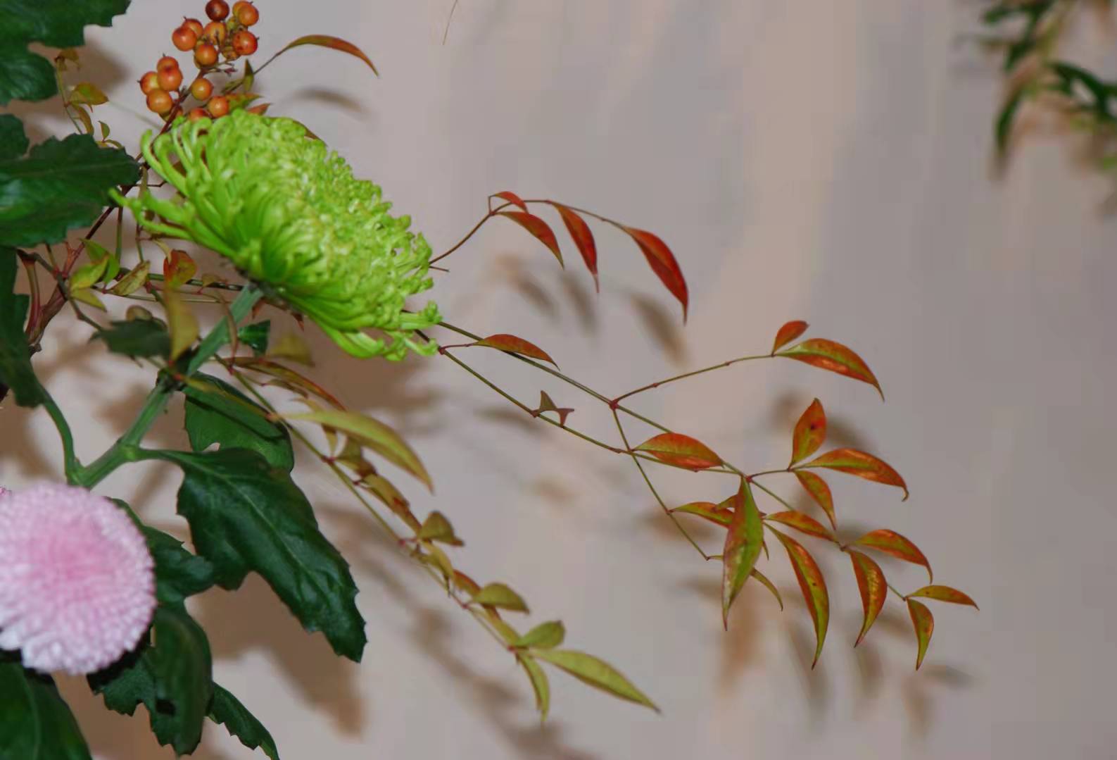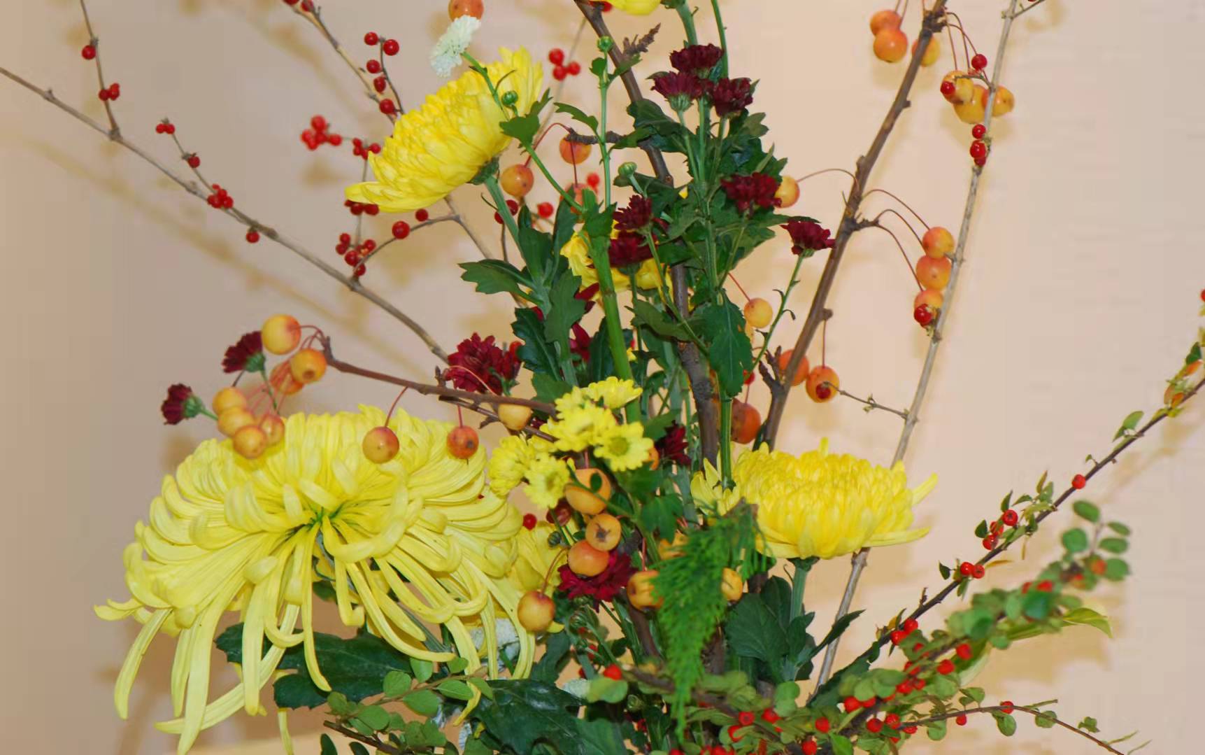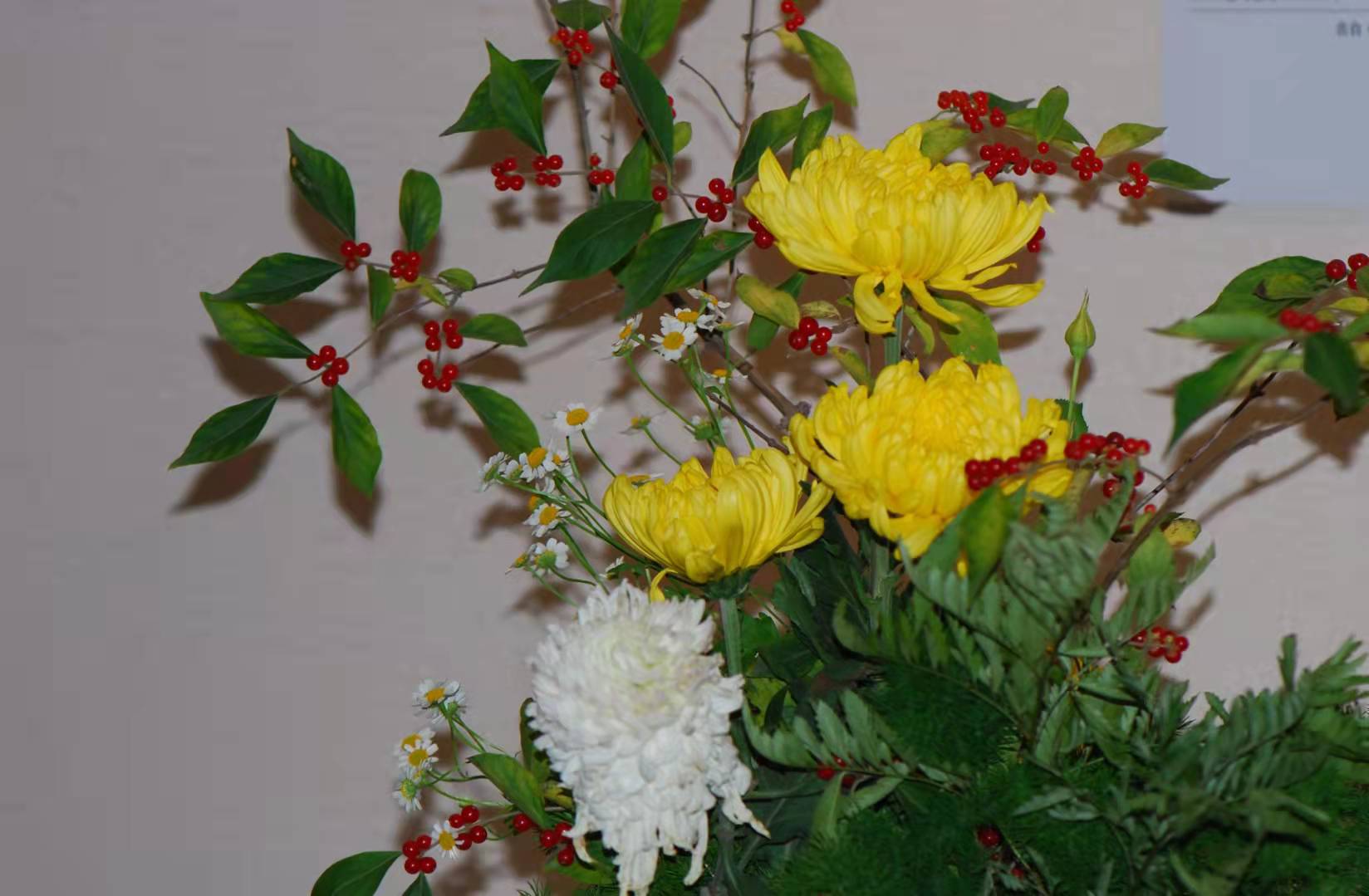 浅红淡白间深黄,簇簇新妆阵阵香,别出心裁的盆景造型艺术让菊花劲添雍容华贵之气,美不胜收!(摄影 武庆新)