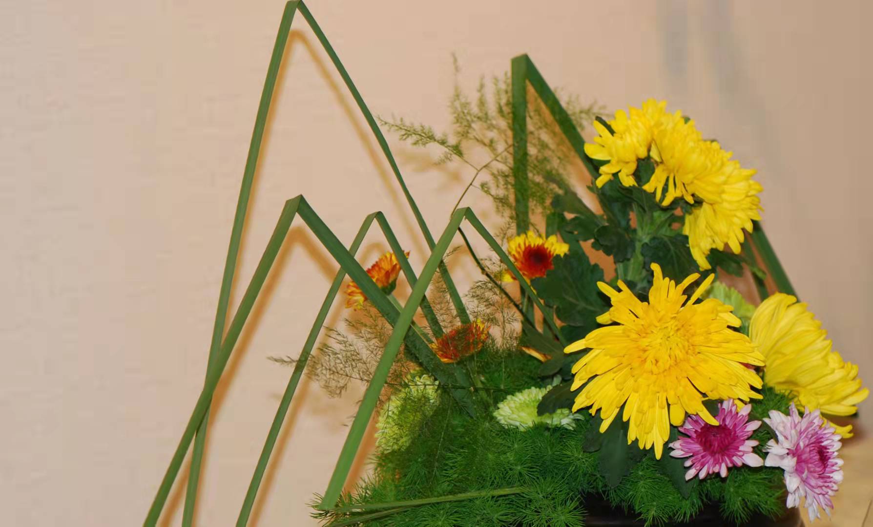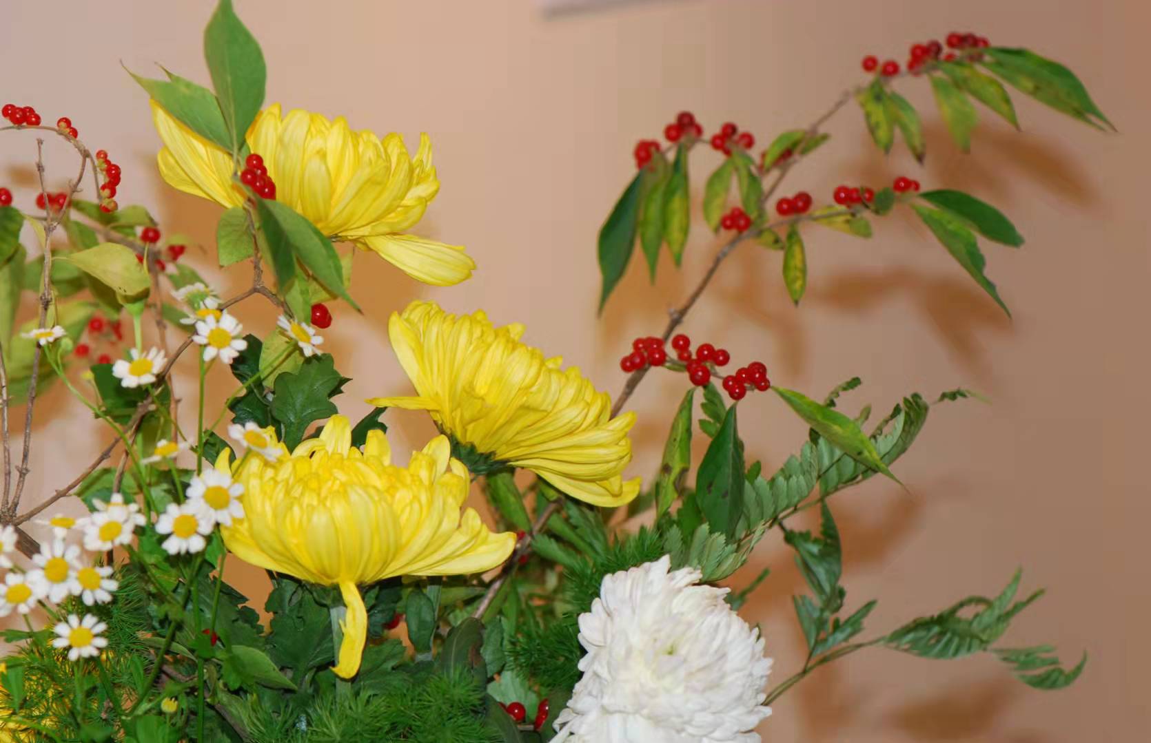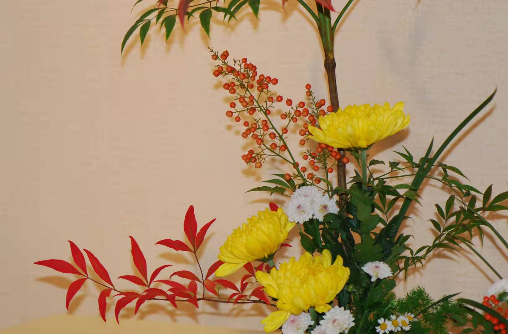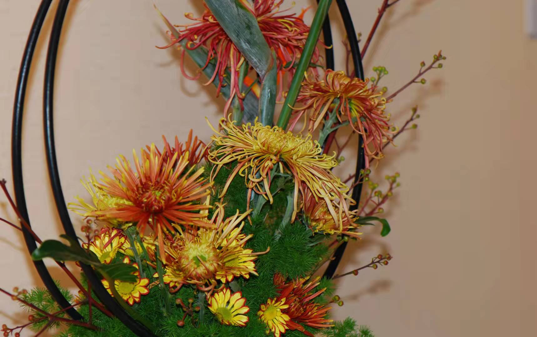 浅红淡白间深黄,簇簇新妆阵阵香,别出心裁的盆景造型艺术让菊花劲添雍容华贵之气,美不胜收!(摄影 武庆新)