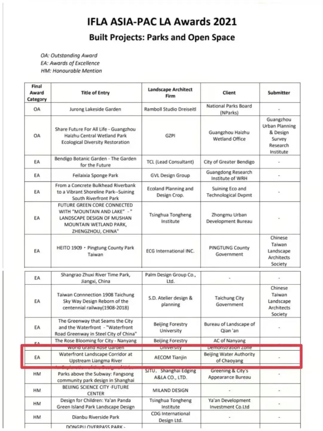 2021年10月18日,国际风景园林师联合会(IFLA)公布了2021年亚太地区风景园林专业奖获奖名单,朝阳区亮马河四环以上景观廊道项目荣获了公园与开放空间类优秀奖。