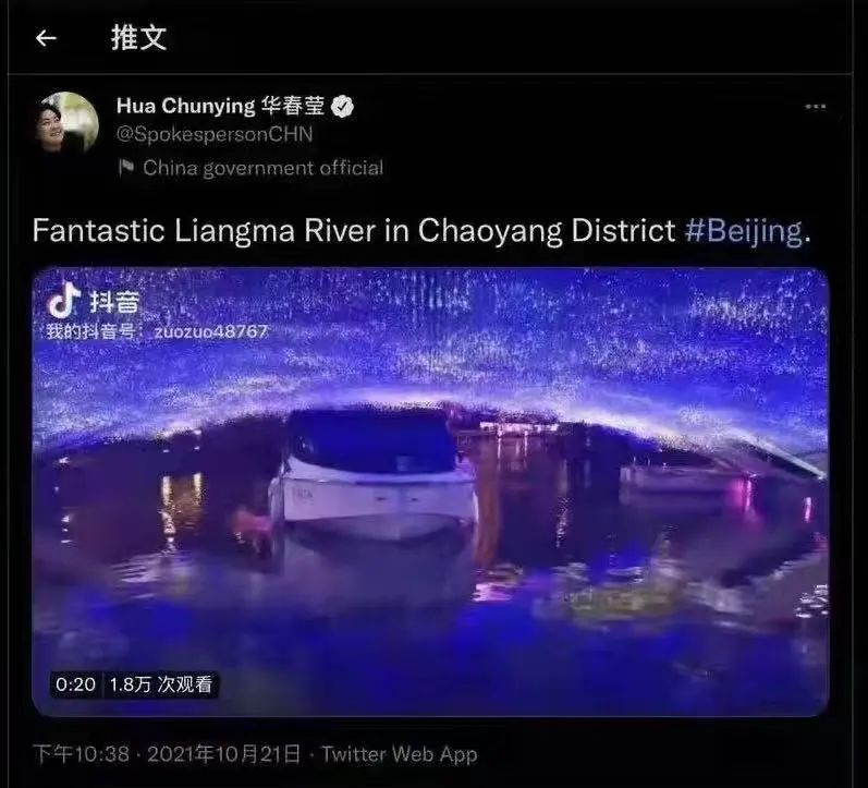 10月21日,外交部发言人华春莹在她的个人推特账号上点赞朝阳区的亮马河风情水岸。她发文:Fantastic Liangma River in Chaoyang District #Beijing.(译:北京朝阳区梦幻的亮马河),并配上了一段网友拍摄的乘船夜游亮马河的短视频。