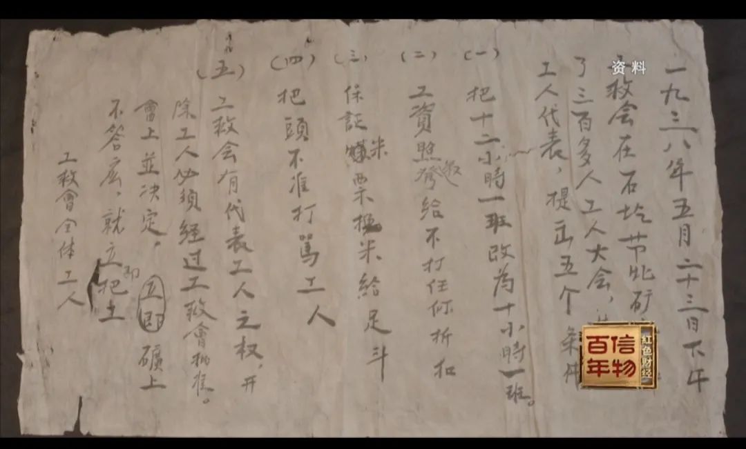这份合同,就是石圪节煤矿矿工在党的领导下,与窑主长期斗争谈判后订立的,里面详细记载了保障工人安全和争取工人权益的五项条约。