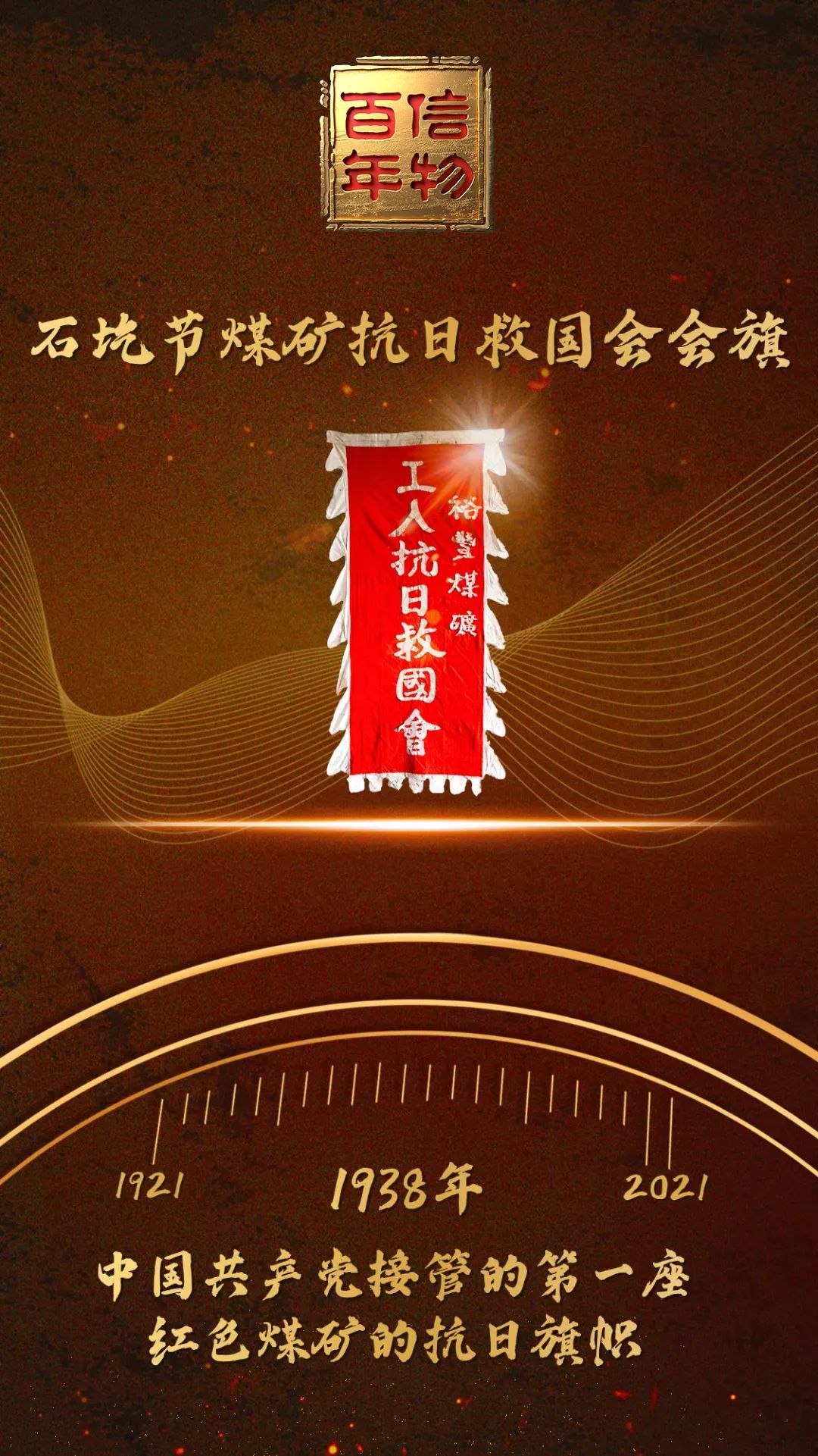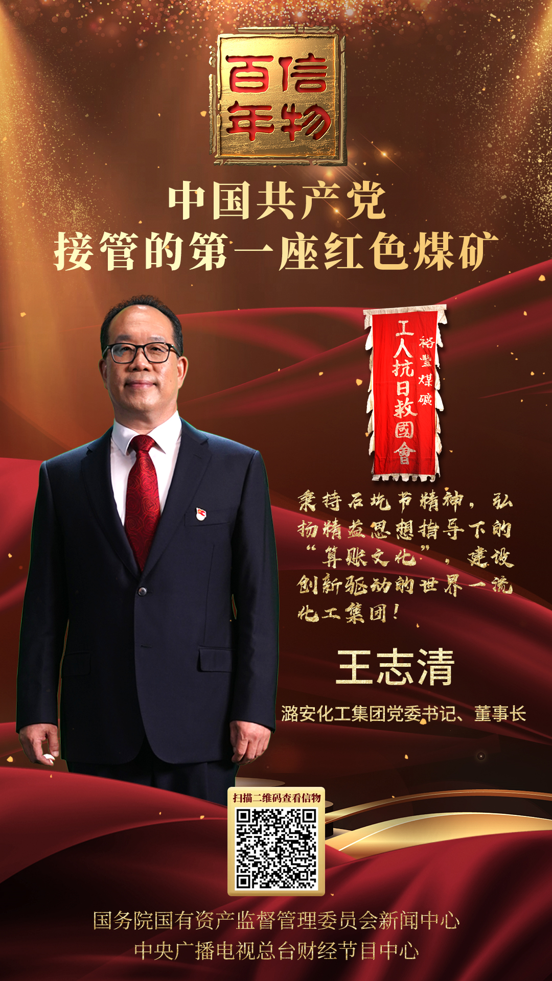 信物讲述人,潞安化工集团党委书记、董事长王志清介绍,这面旗帜,是石圪节煤矿的前身——裕丰煤矿的工人在共产党的领导下,建立抗日救国会时树立起来的。正是在这面旗帜的引领下,工人群众从日寇和国民党反动派的手中夺回了煤矿,使石圪节煤矿成为中国共产党接管的第一座红色煤矿,它不仅象征着煤矿工人反抗侵略和压迫的坚强意志,也代表着中国共产党带领群众走向胜利那无畏而坚定的信心。