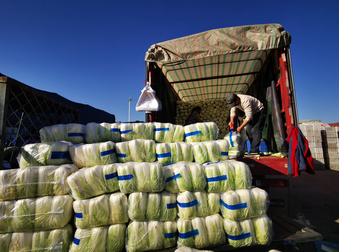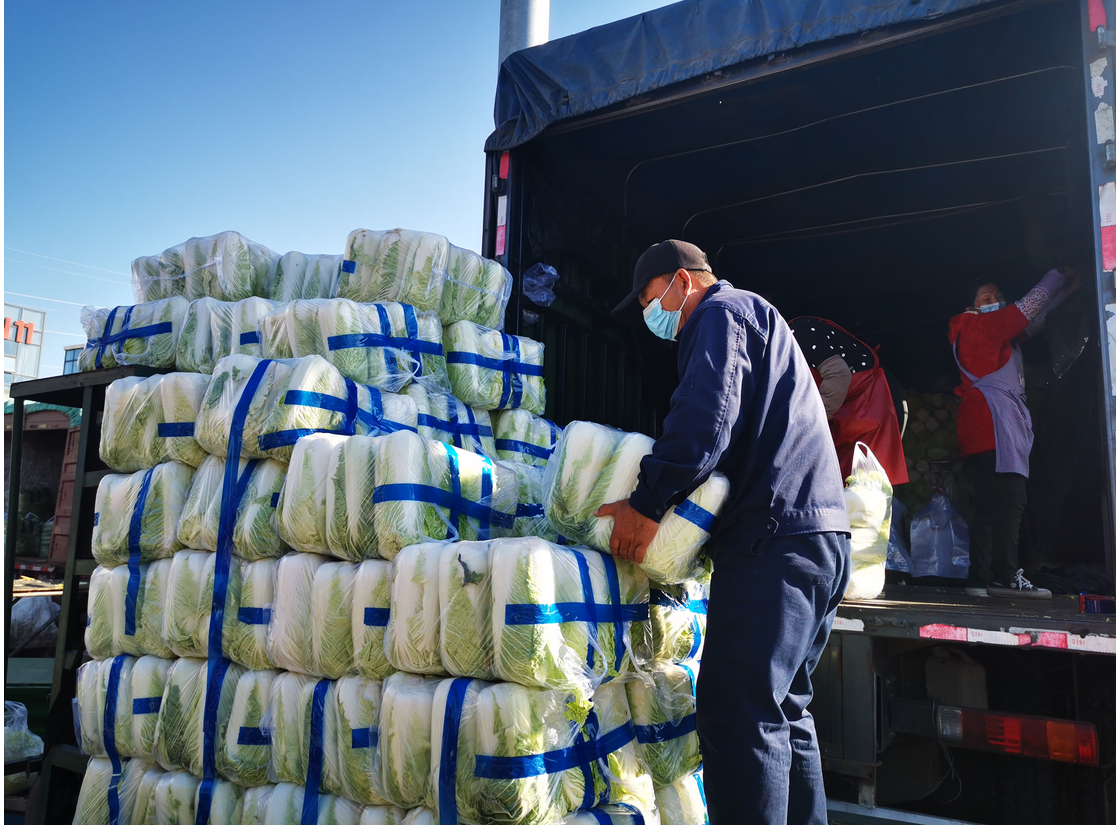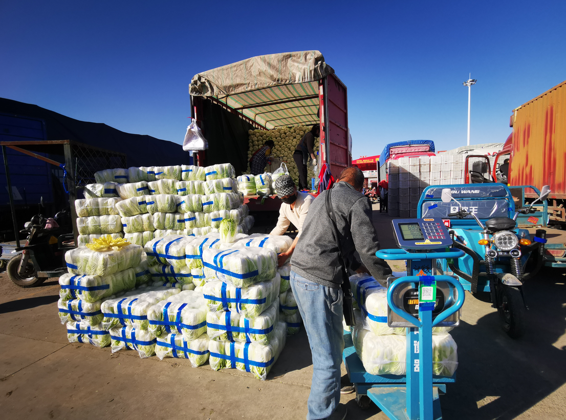白菜交易区一片繁忙。在商户杨斌的车位,工人正忙着打包出货。“我现在主要销售的是吉林的大白菜,今天来了一车是3.6万斤,明天大概会到货两车7.2万斤。吉林我还有170亩大白菜未采收,这些大白菜将陆续供应市场。”杨斌介绍,他的白菜根据品种品质不同,一斤的价格大概在0.7元至1.2元之间。