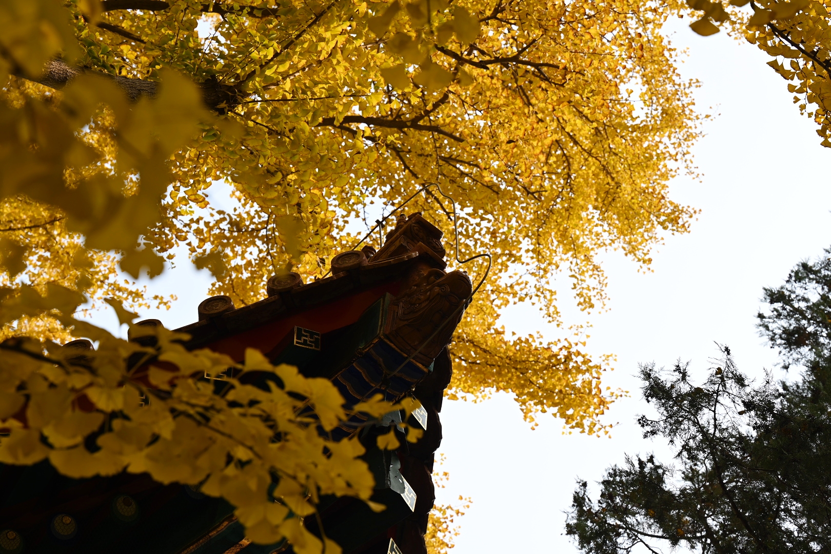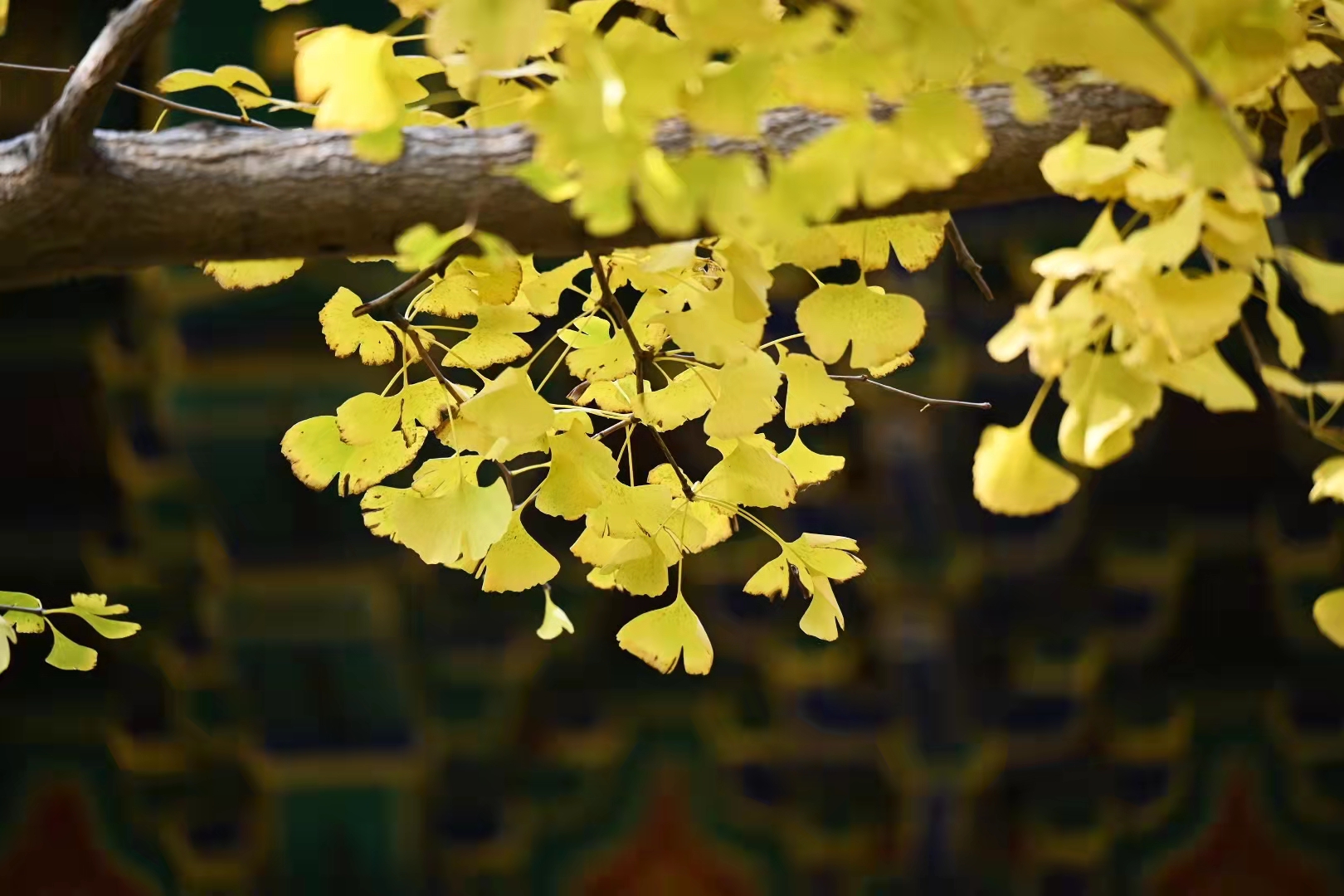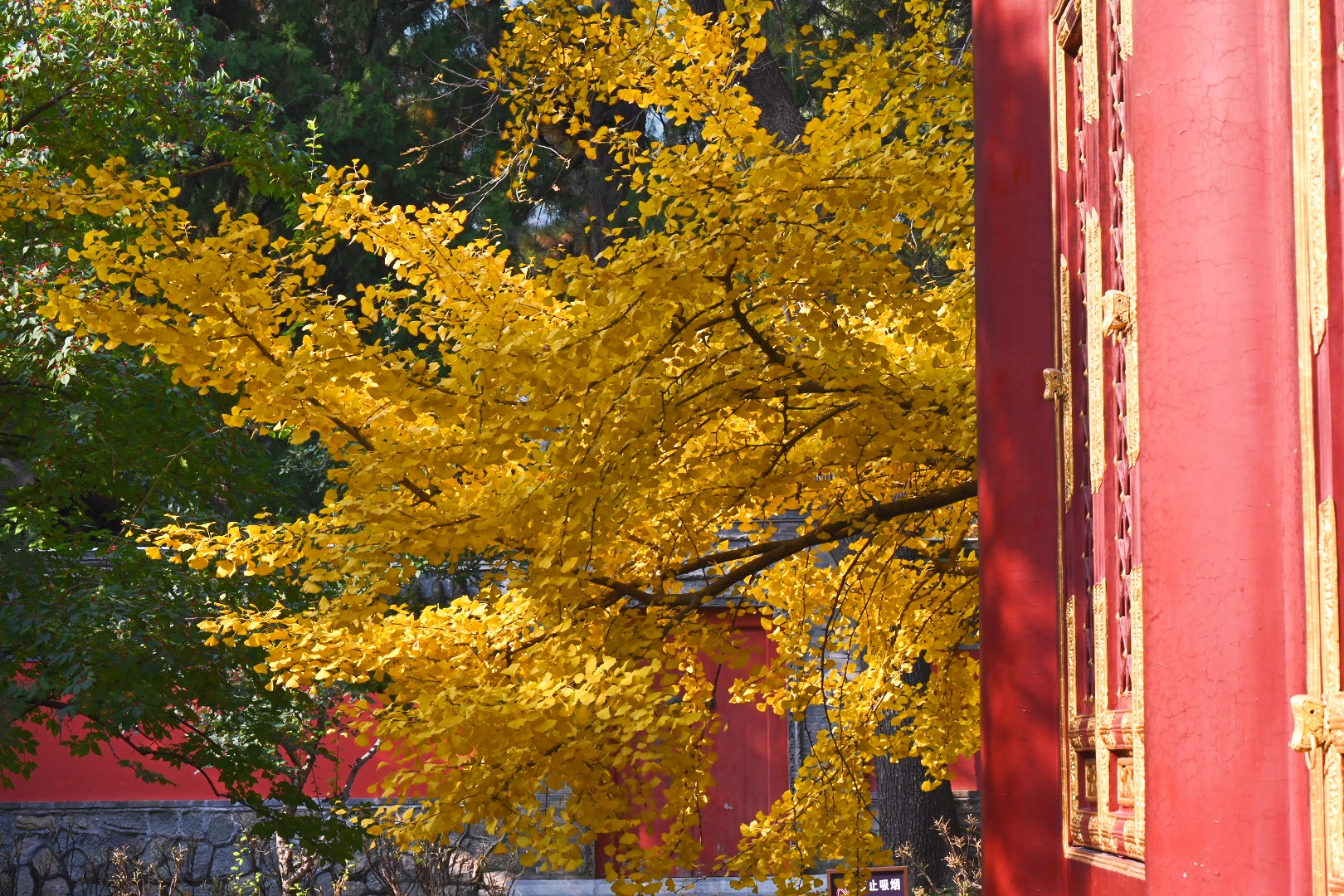 秋意正浓时,卧佛寺内的银杏古树簇拥成片片明黄,当阳光透过茂密的枝叶与朱红的墙面上相互映照,如云如霞,光影斑驳。这才是北京的秋天!