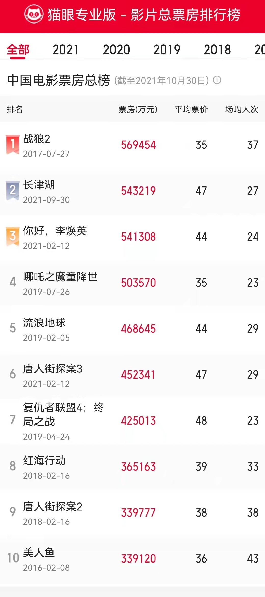 截至10月30日早上十时许,根据猫眼专业版数据统计,电影《长津湖》的票房超过了《你好,李焕英》的54.13亿元,上升到中国影史票房的第二名,目前,《战狼2》排在第一位。