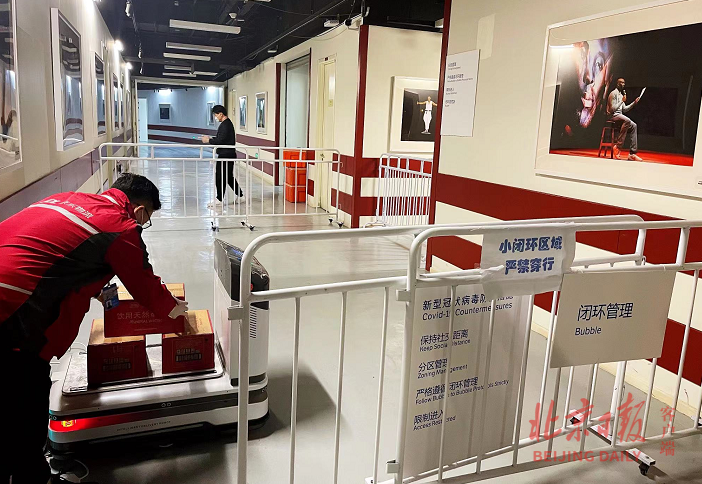 走进五棵松体育中心场馆竞赛馆竞赛层,走廊里摆放着铁马作为隔离设施,两道铁马将竞赛层区分为闭环内、闭环外区域,两道铁马中间间隔4米,这个区域就是缓冲区,智能物流机器人就在这个区域工作。测试赛期间,闭环内外的物资交流,也在这个区域进行。