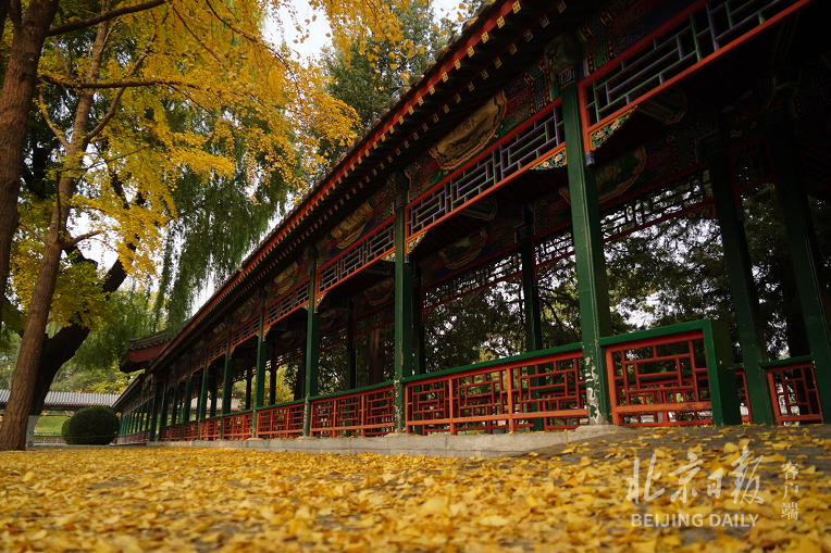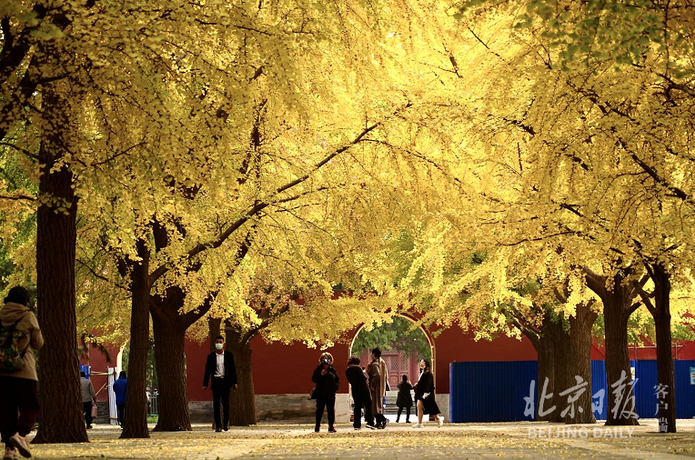中山公园社稷坛南侧有一条银杏大道。这里有18株树龄在50年左右、树干直径达30至40公分银杏树。时至深秋,银杏树叶变成金黄色。秋风吹过,翩翩落叶给地面铺上一层“金色的毯子”。坛墙处,金黄的银杏叶在红墙的衬托下绚烂至极。是公园秋天里最美的景观之一。