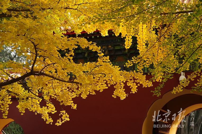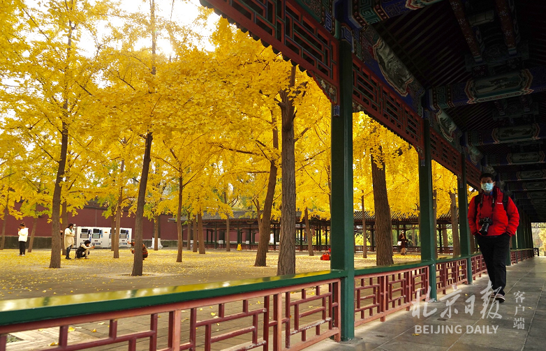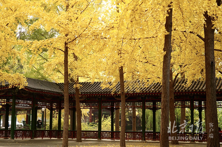 公园南门内西侧栽植的59株银杏,金黄的树冠游廊形成一道独特的风景。