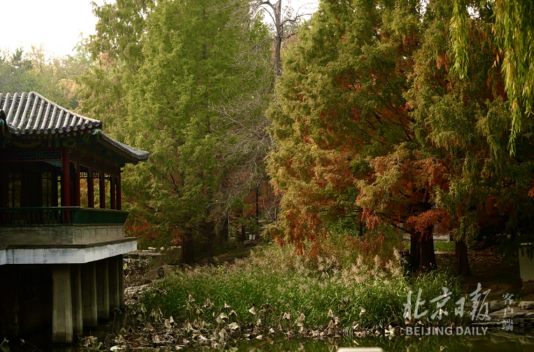 西坛门外小山丘上可见一座古朴的茅亭掩映于金黄的秋色中,这里就是公园的“秋染茅亭”景观。