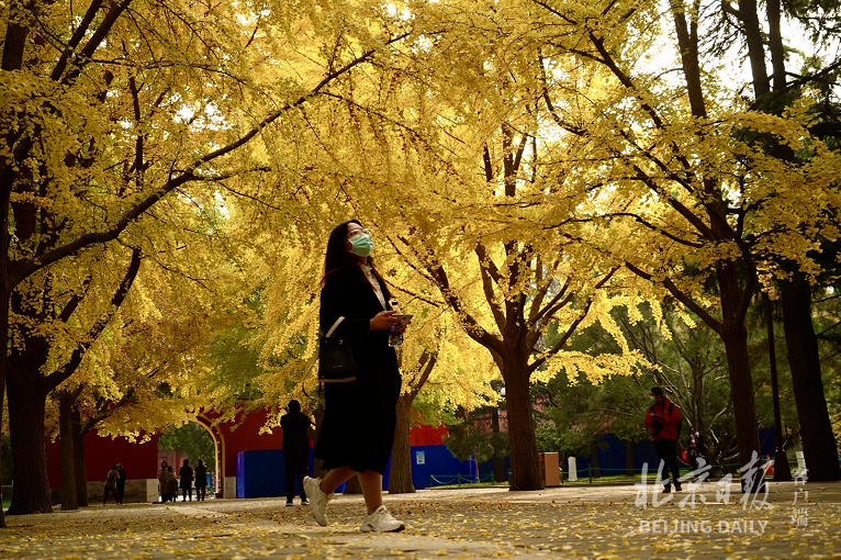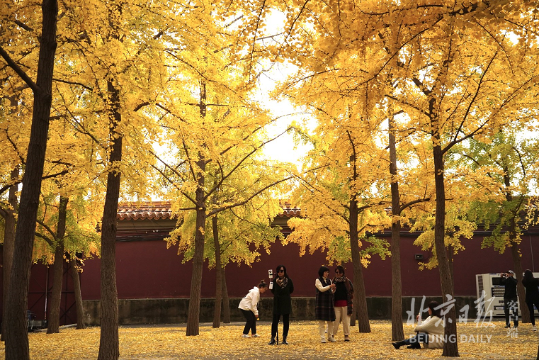 11月2日,时至深秋,中山公园迎来最美季节,满园金黄色,吸引游客拍照留念。