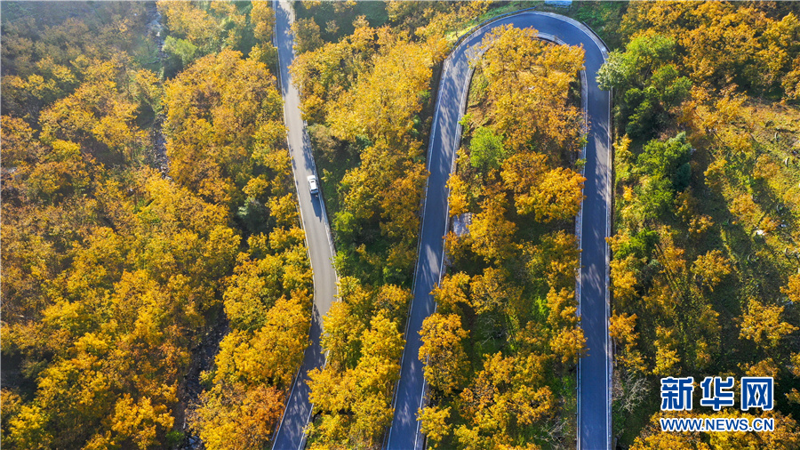 10月31日,航拍安徽省宣城市绩溪县荆州乡的盘山公路。深秋时节,这里层林尽染,金黄色的万亩山核桃林与漫山遍野的秋叶交相辉映,构成一幅幅色彩斑斓的“油画”。