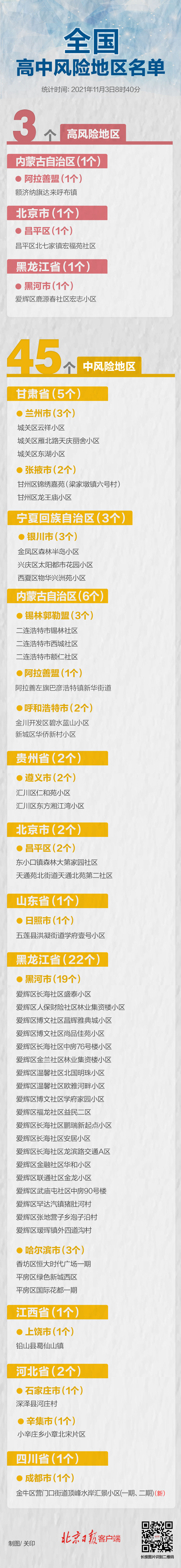 目前全国共有3个高风险区和45个中风险区。