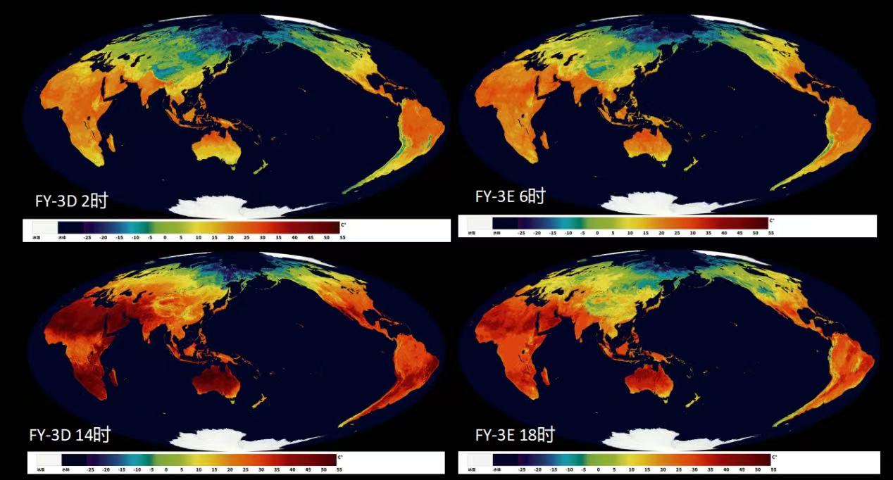 风云三号D、E两颗卫星获得的全球昼夜与晨昏四个时刻的地表温度,可以形成观测时间链。从时间分布上看,昼夜与晨昏时刻的陆表温度差异明显,白天由于太阳辐射的加热作用陆表温度最高,黎明时分由于夜间地表出射辐射的冷却使黎明时分陆表温度成为一天中最低的时刻。从空间分布看,高纬度及北极地区陆表温度最低;以赤道为中心的南北纬30度的地区(如非洲、中亚、美国西部、澳大利亚等)是陆表温度最高的地方,也是地球最热的区域。地处中纬度的青藏高原由于其海拔高度使其夏季成为巨大的冷源,冬季成为巨大的热源,从而对全球温度及天气气候形成巨大的影响。