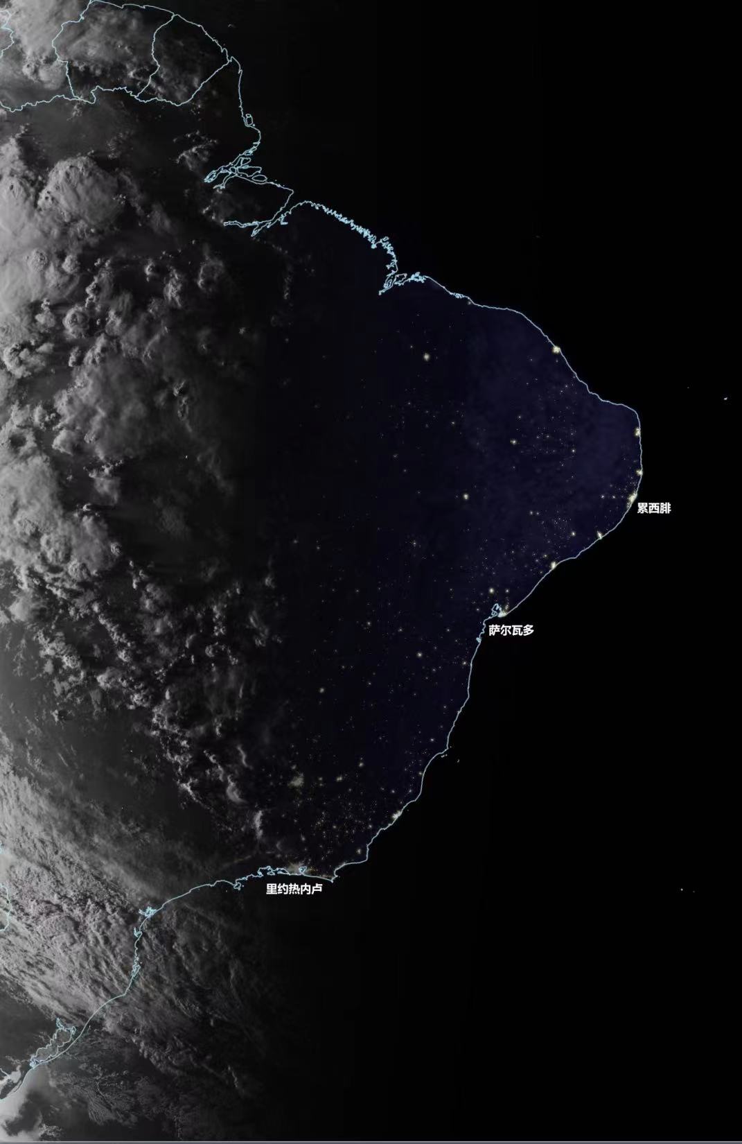 而与此同时,南美大陆的东边已是灯火通明,城市的灯光在夜晚熠熠生辉。里约热内卢、巴西利亚、圣保罗等巴西大城市清晰可见。