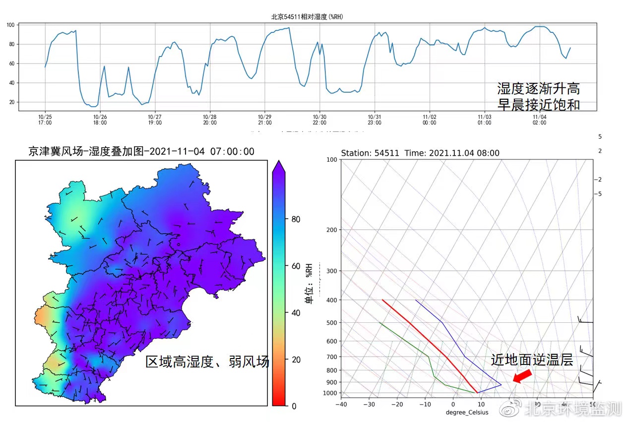 10月下旬以来,华北地区以低压或均压控制为主,风力小,逆温强,区域整体大气条件偏静稳。尽管26日和31日左右有弱冷空气影响,但影响范围偏小,无法起到彻底清除区域污染的作用。对北京市来说,11月2日以来,地面相对湿度逐渐升高,日间最低湿度从59%升至77%,夜间则持续接近饱和湿度,同时中低层(925hpa气压,约800米高度)气温连续上升超过9℃,超过地面气温,导致近地面出现“上层暖、下层冷”的逆温层污染带,污染物无法垂直扩散,进一步积累转化。在高湿条件下,PM2.5组分中的二次硝酸盐浓度与PM2.5总浓度同步增高,硝酸盐成为最主要的组分,有机物、硫酸盐等其他组分保持稳定,表明二次硝酸盐的生成转化也是污染持续积累增长的原因之一。