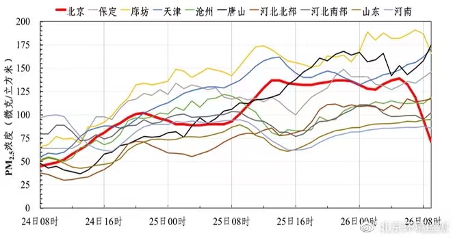 0月24-26日北京及周边地区PM2.5浓度时间演变