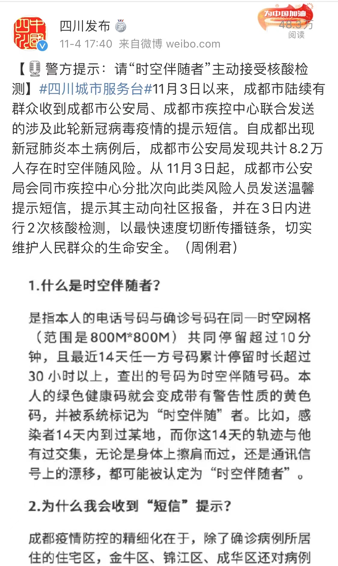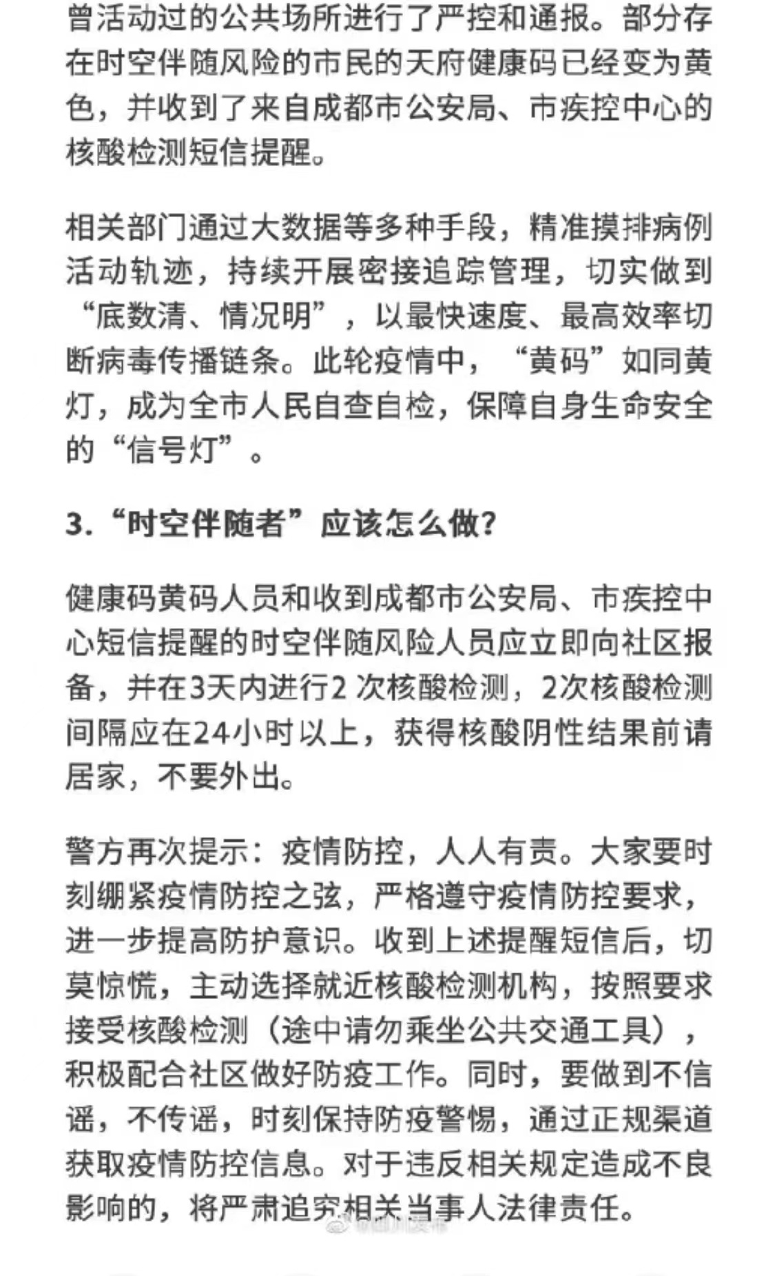从11月3日起,成都市公安局会同成都市疾控中心按照《新型冠状病毒肺炎疫情防控及管理指引》,分批次向此类风险人员发送温馨提示短信,提示其主动向社区报备,并在3日内进行2次核酸检测,以最快速度切断传播链条,切实维护人民群众的生命安全。